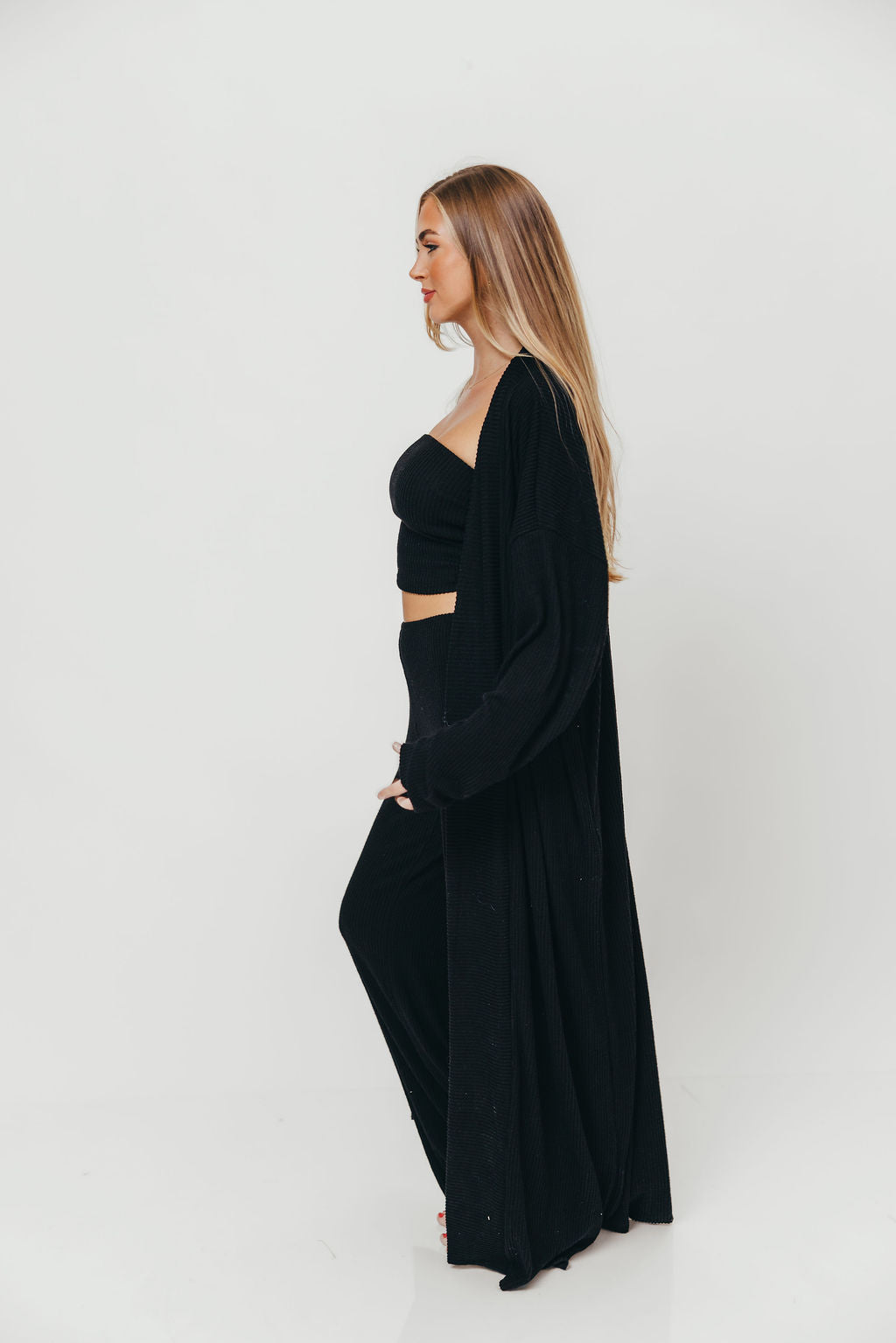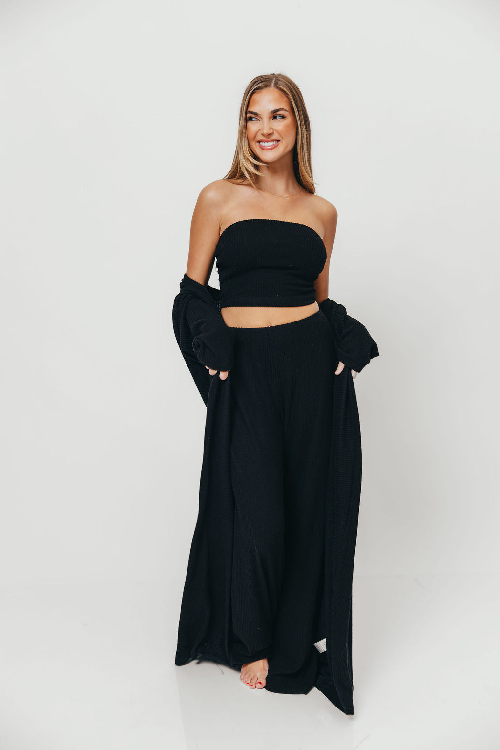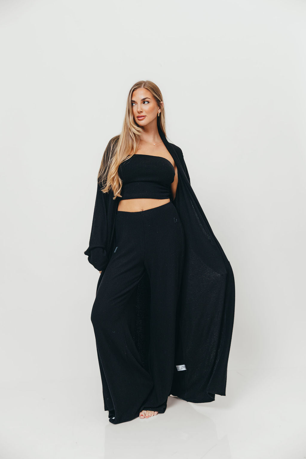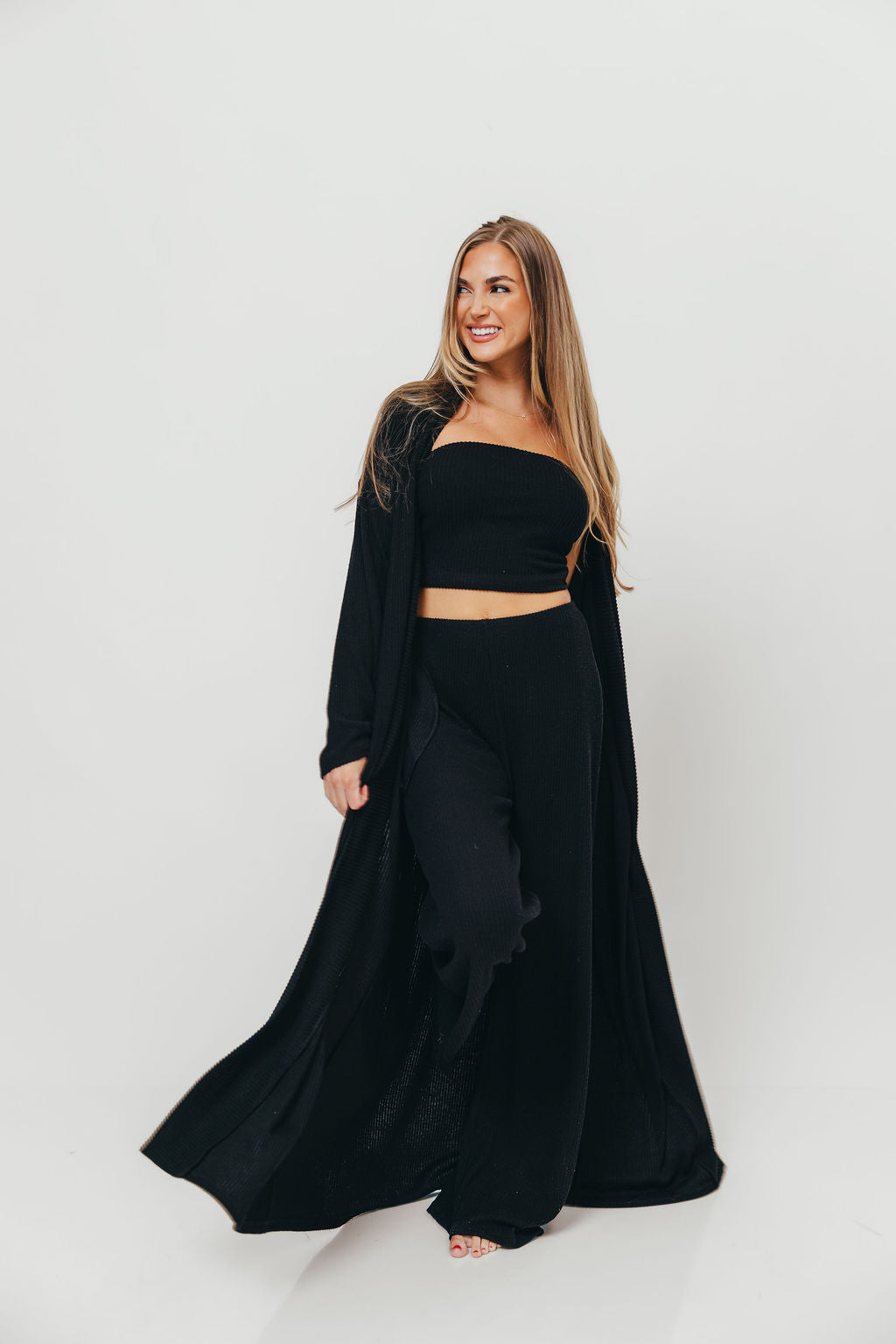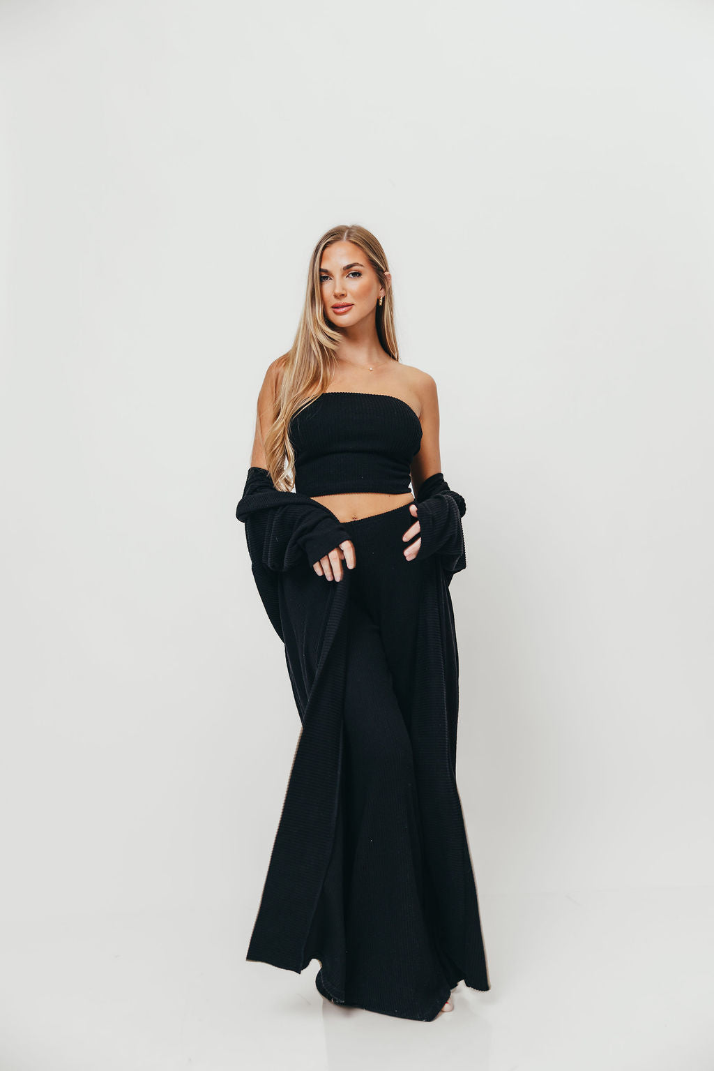 GARMENT DETAILS: Luxurious three piece set in a soft ribbed knit. Strapless tube top features a cropped silhouette, and pants have an elasticated waistband and a flowy, wide-leg profile. Cardigan has long sleeves and a long duster length.