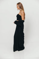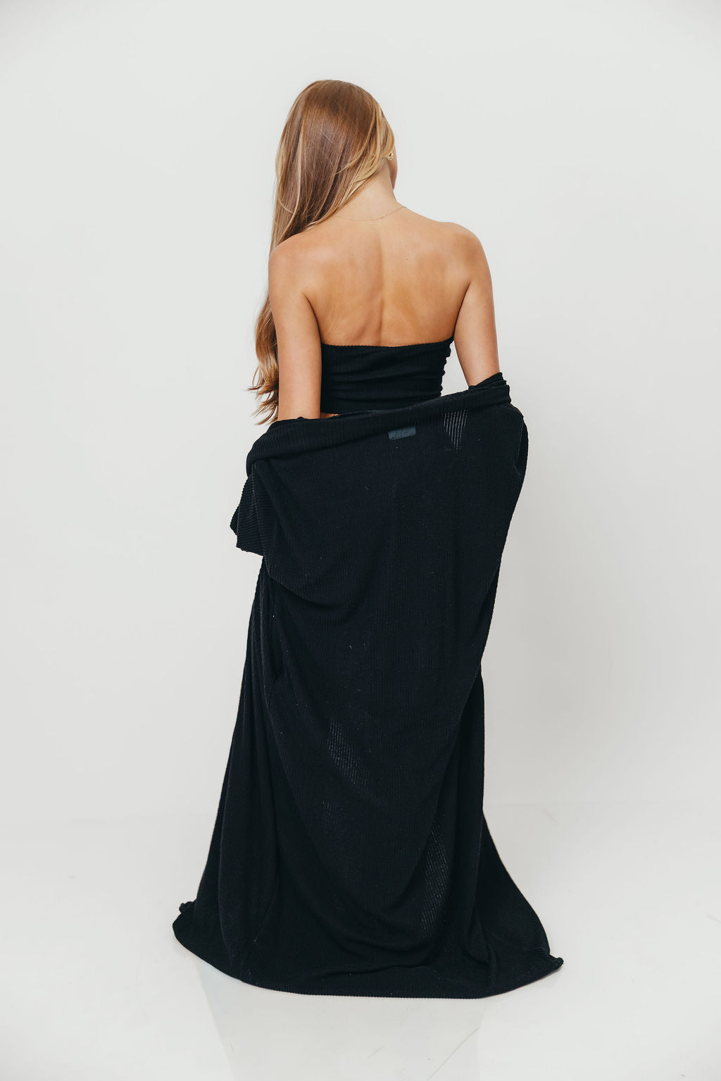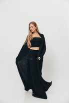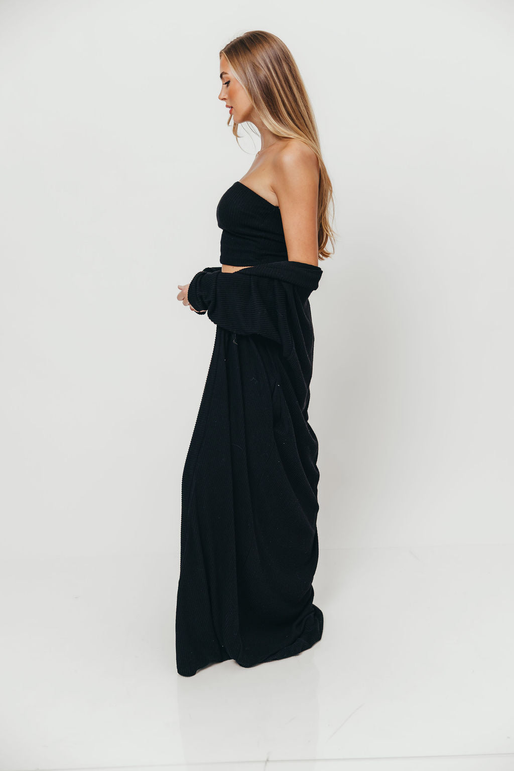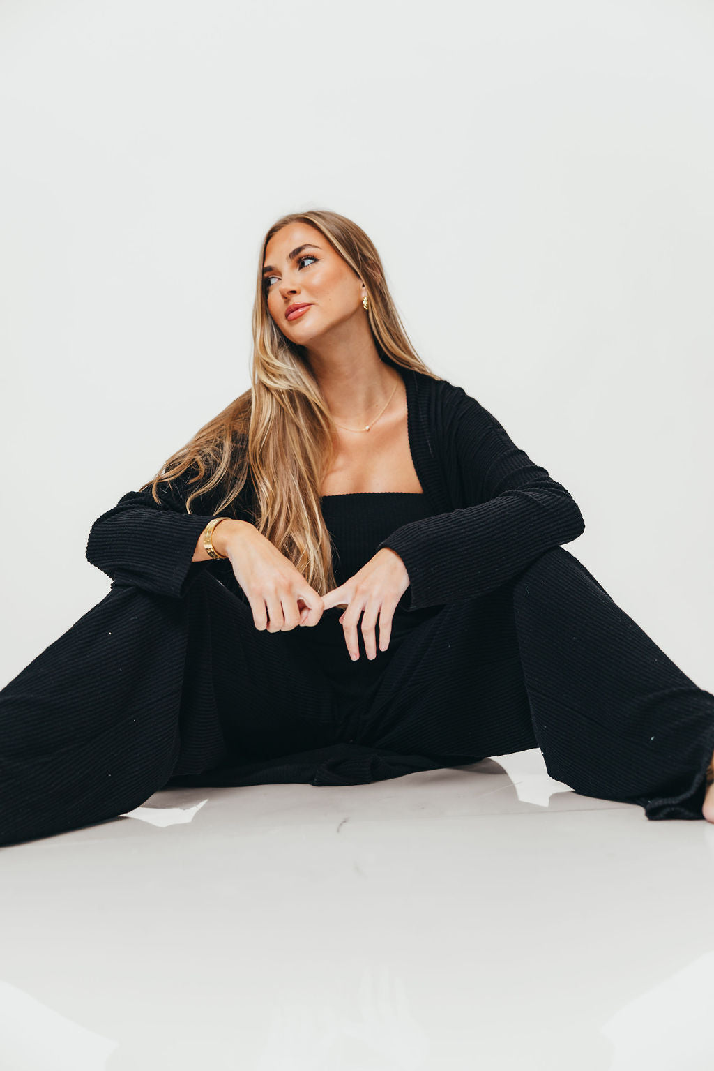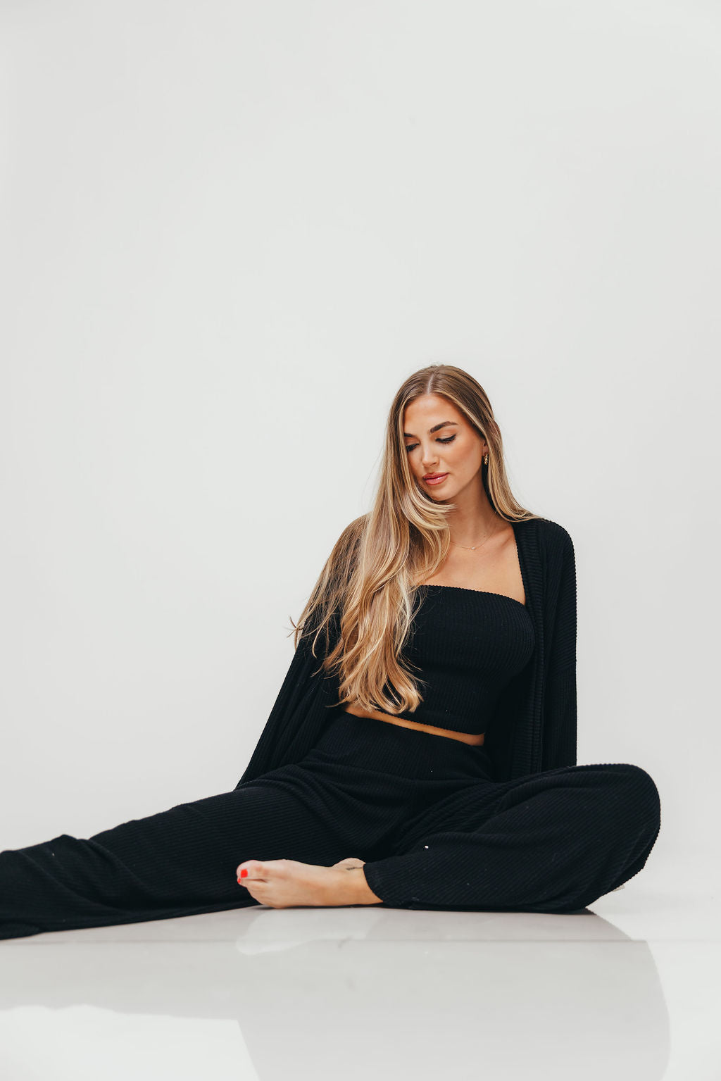 GARMENT DETAILS: Luxurious three piece set in a soft ribbed knit. Strapless tube top features a cropped silhouette, and pants have an elasticated waistband and a flowy, wide-leg profile. Cardigan has long sleeves and a long duster length.