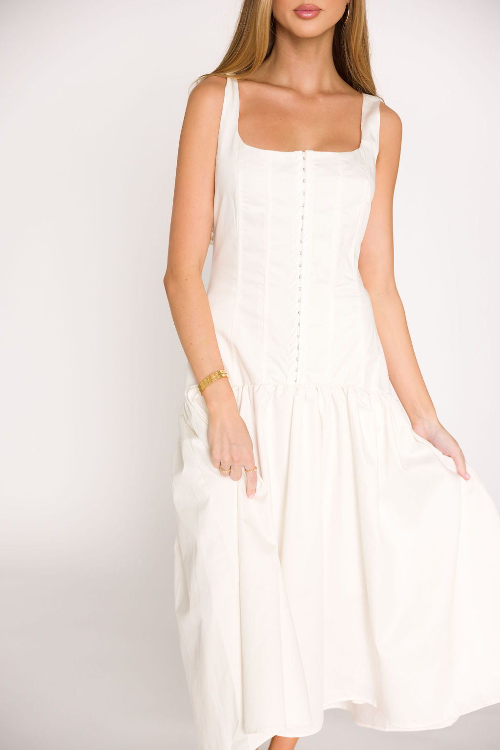 GARMENT DETAILS: Cotton-blend midi dress with square neckline, dropped waist, and shirred accents. Features a corset-style bodice, with hook & eye front closure and a full, flowy skirt.