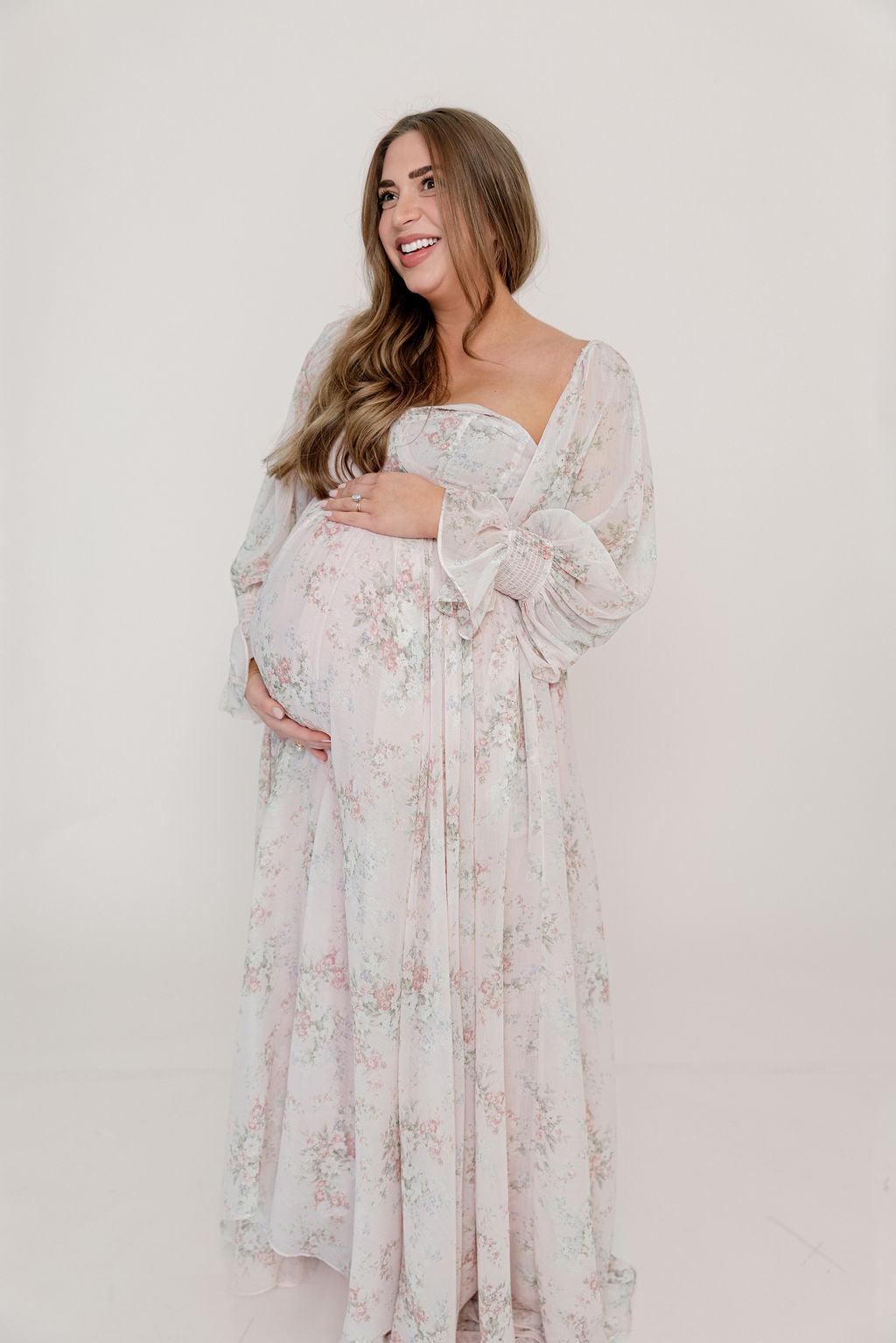 This gown deserves the word breathtaking. Meet the Delilah Maxi, an absolutely stunning statement dress that is both whimsical and romantic. This premium gown is crafted from eight yards of lightweight floral material, with a bustier-style bodice, swoon-worthy skirt and train, and sheer sleeves that can be worn on or off the shoulder depending on your mood! The Delilah Dress is a centerpiece of a dress and perfect for every body type, including expecting mamas. (P.S. it makes an incredible client closet dress for photographers!)