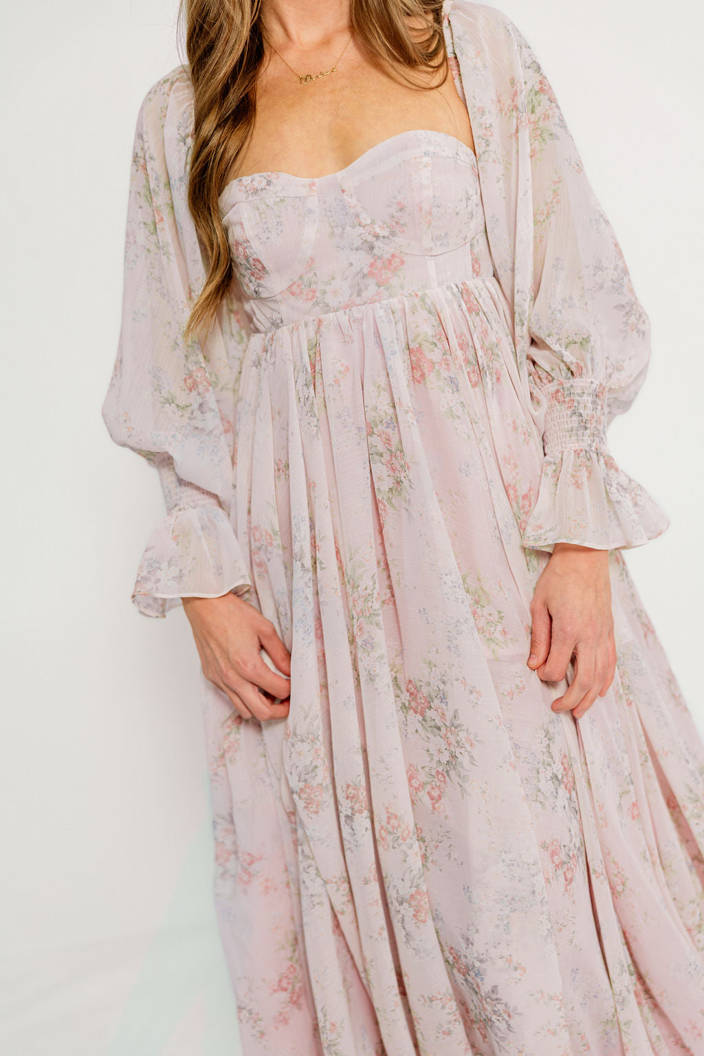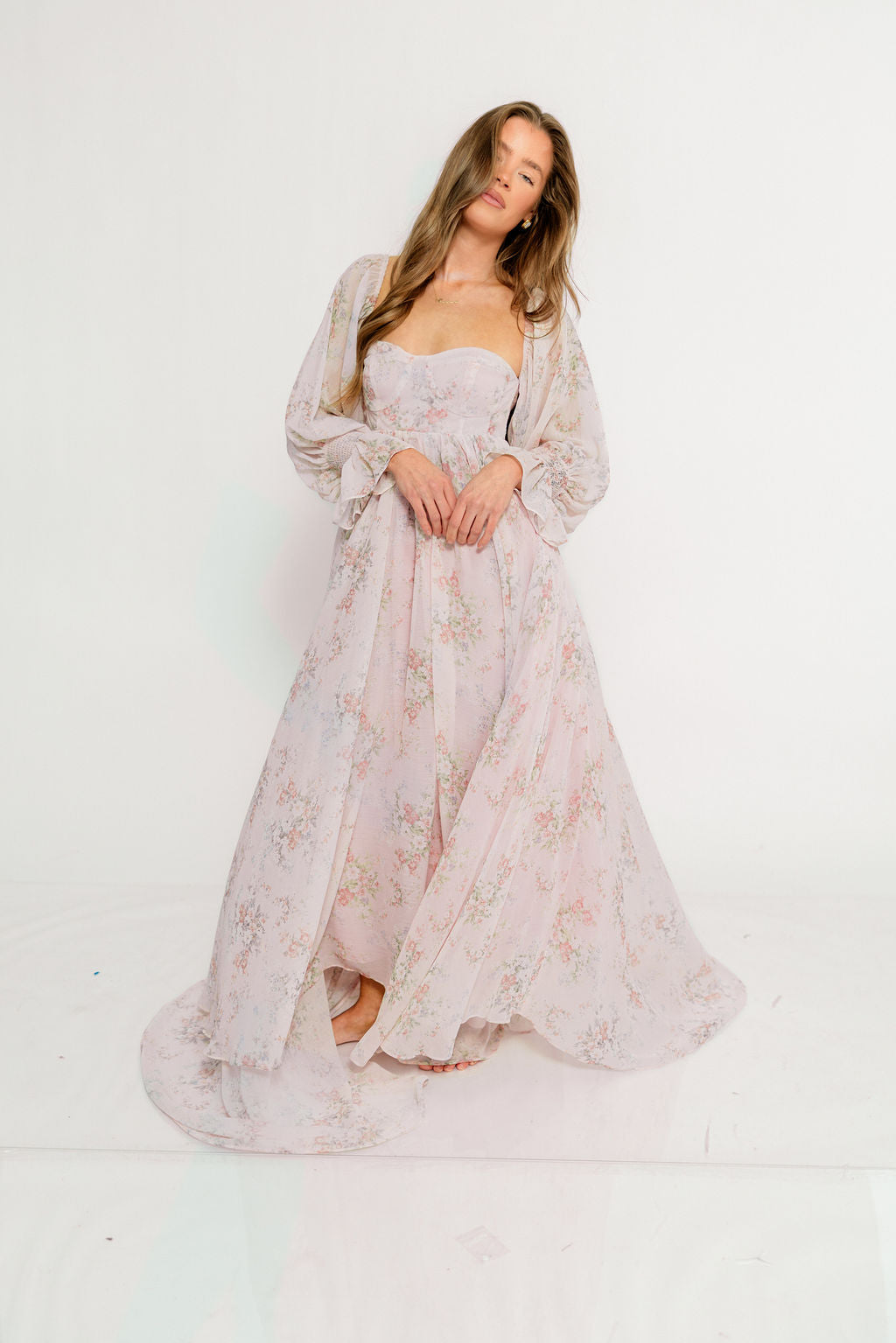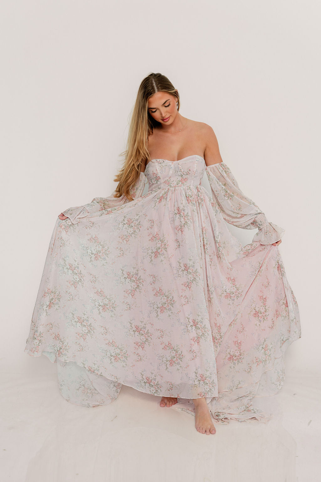 GARMENT DETAILS: Premium floral maxi dress in a lightweight, shirred chiffon. Features a soft bustier-style bodice (no boning), sweetheart neckline, smocked back panel, and sheer long sleeves with elastic cuffs and ruffles. Sleeves can be worn on or off the shoulder. Finished with a sweeping maxi-length skirt and dramatic train. Lined.