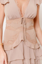 GARMENT DETAILS: Silky and glamorous midi dress with short ruffled sleeves, plunging V-neckline, and gathered waist with front tie detail. Features a flowy, multi-tiered ruffled skirt and delicate lace details.