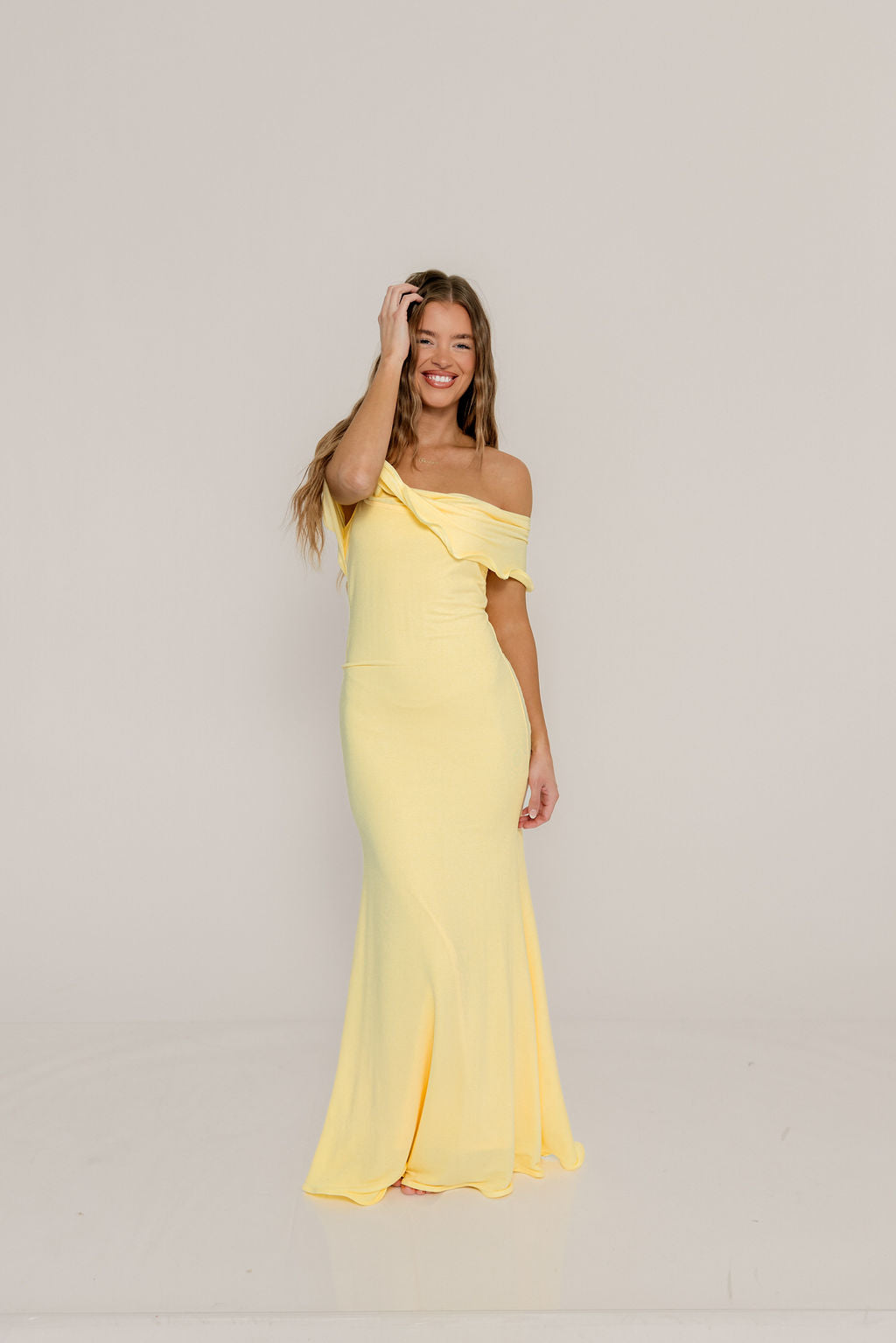 GARMENT DETAILS: Bodycon-style maxi dress with folded off-the-shoulder neckline, fit-and-flare silhouette, and scalloped edges.