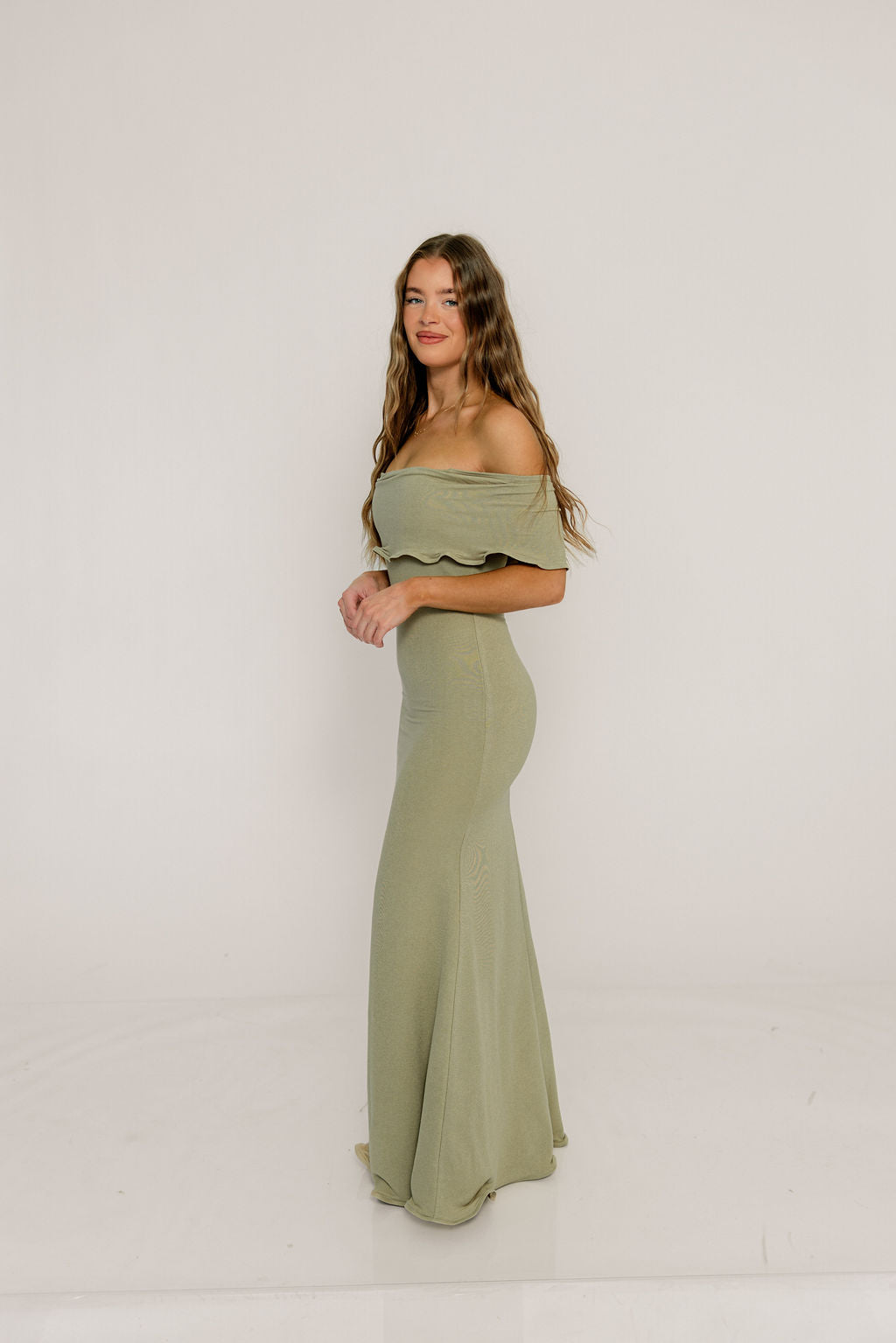 GARMENT DETAILS: Bodycon-style maxi dress with folded off-the-shoulder neckline, fit-and-flare silhouette, and scalloped edges.