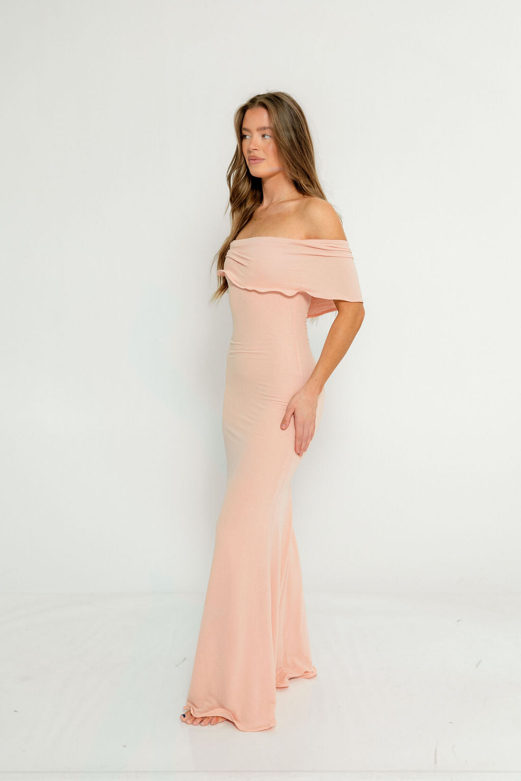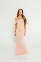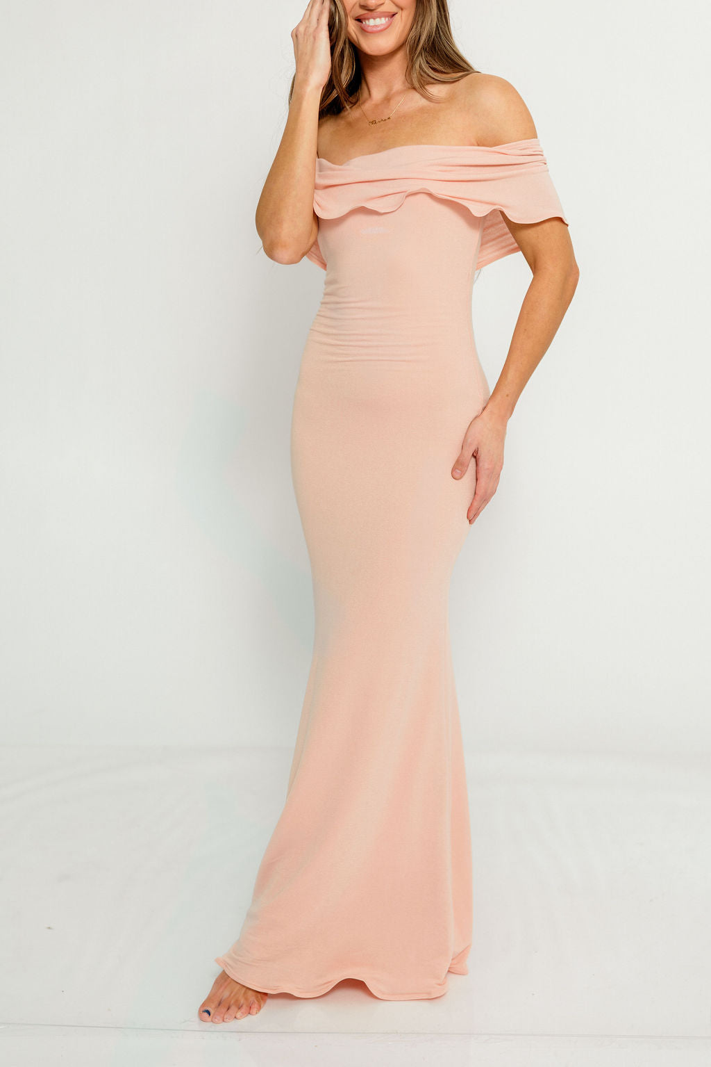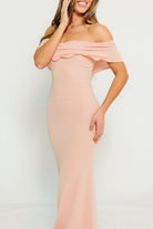 GARMENT DETAILS: Bodycon-style maxi dress with folded off-the-shoulder neckline, fit-and-flare silhouette, and scalloped edges.