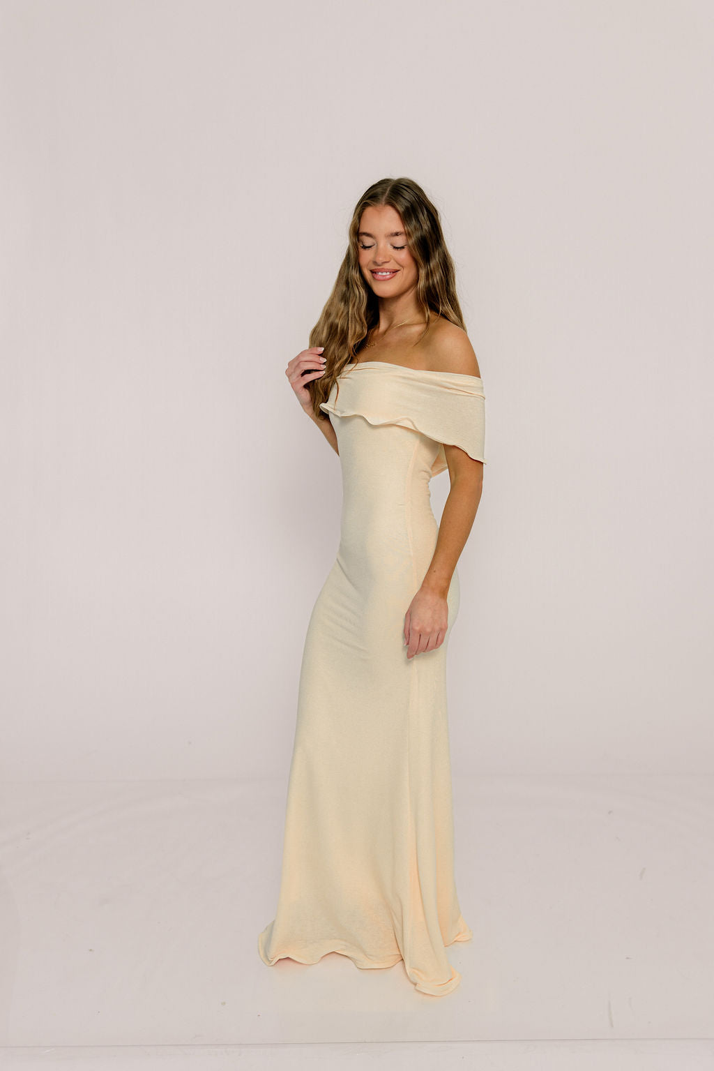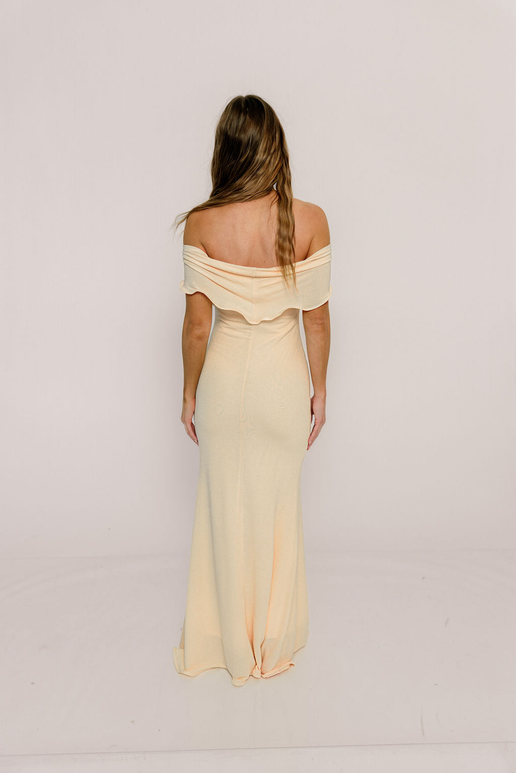 GARMENT DETAILS: Bodycon-style maxi dress with folded off-the-shoulder neckline, fit-and-flare silhouette, and scalloped edges.