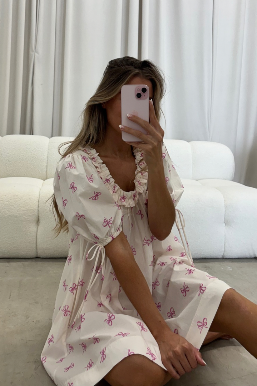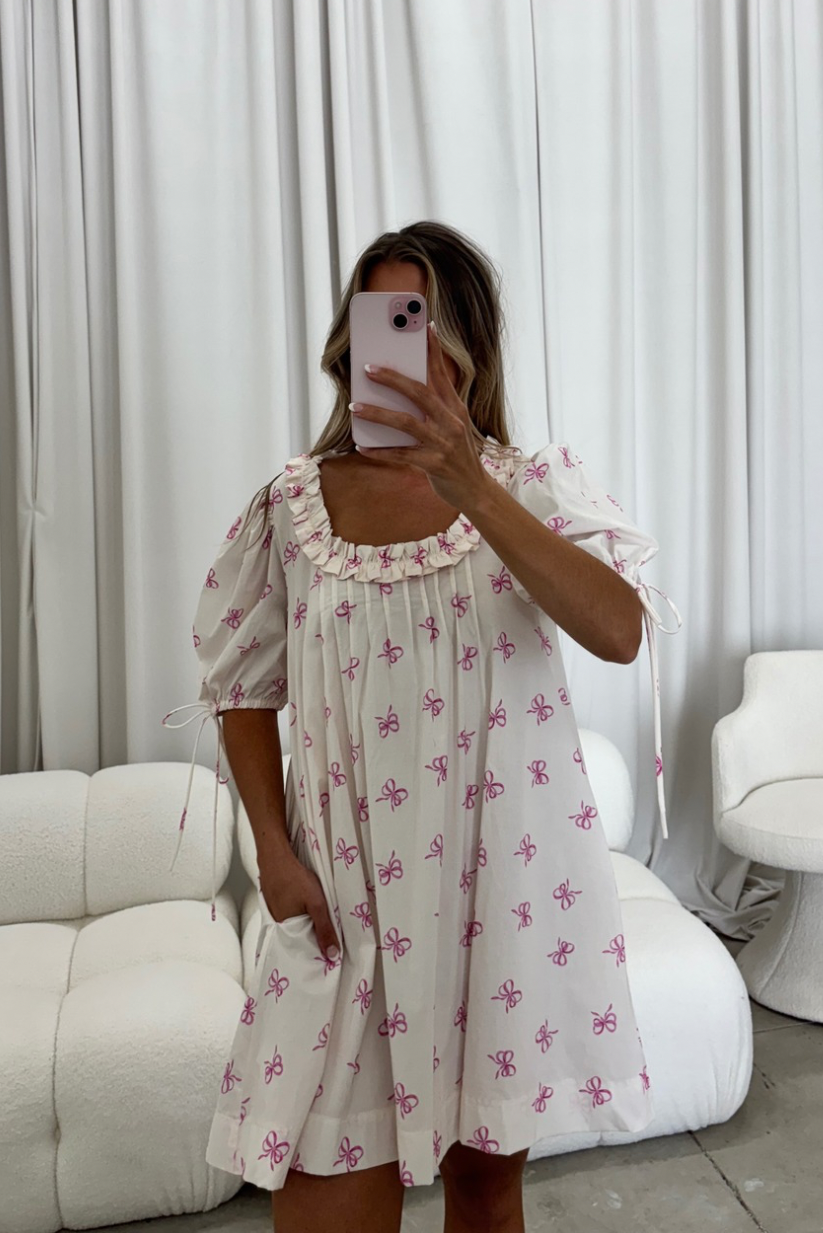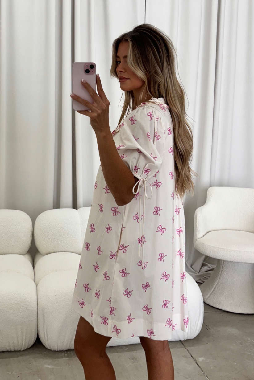 Minnie 100% Cotton Bow Print Babydoll Dress in Pink *Final-Sale*