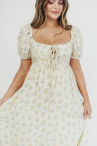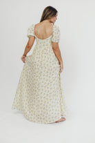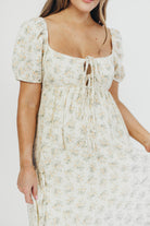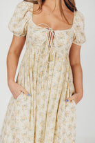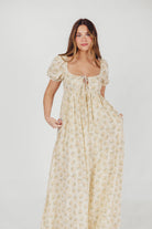 GARMENT DETAILS: Lightweight cotton maxi with a statement square neckline with double tie front details, plus gently puffed short sleeves and empire-waisted silhouette. Features hidden in-seam pockets, scooped back neckline, and a voluminous skirt. Lined.