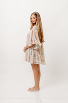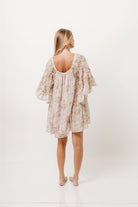 GARMENT DETAILS: Soft relaxed mini dress with scooped neckline, 3/4 length ruffled sleeves, and an empire waist with flowing babydoll silhouette. Lined.