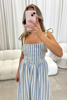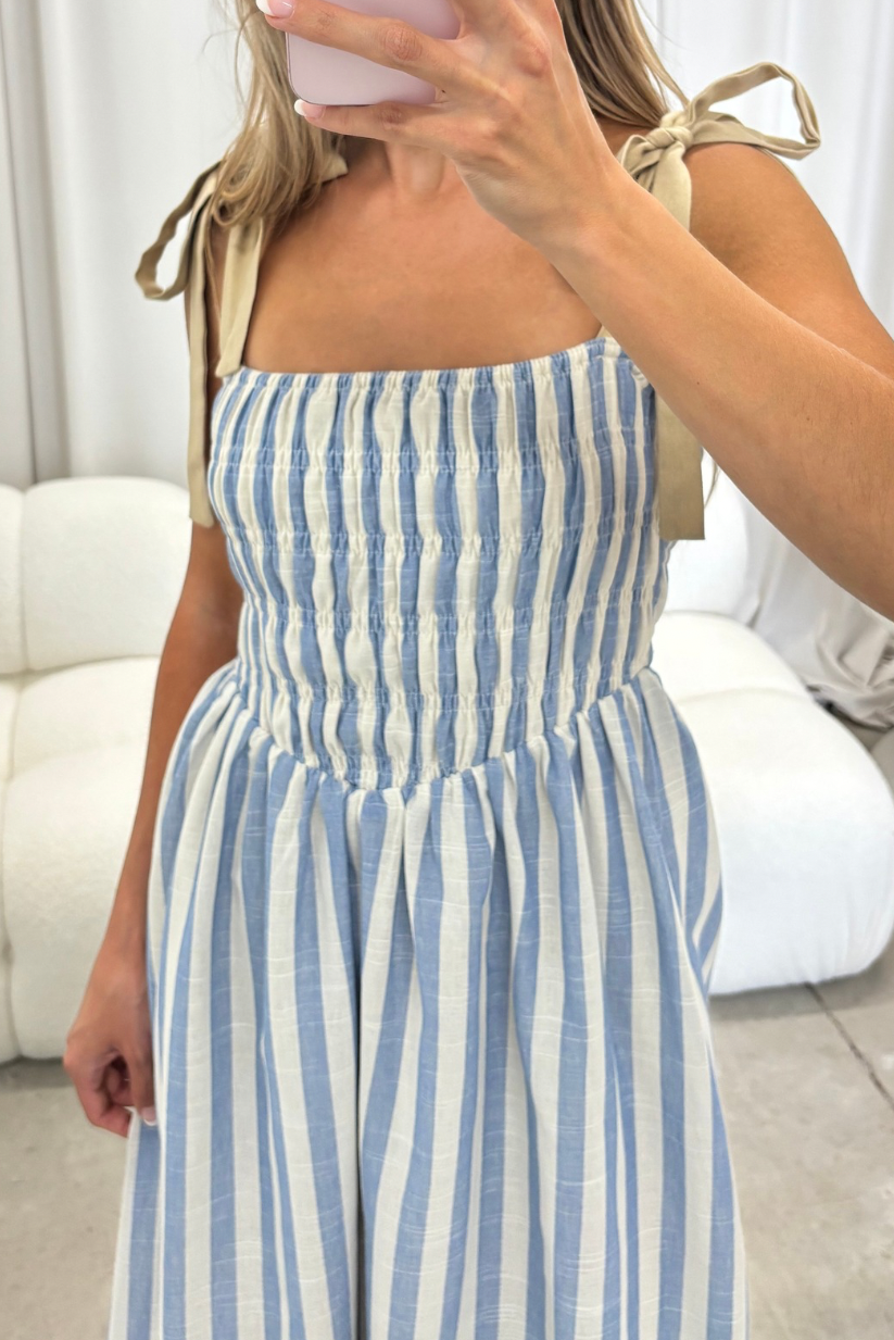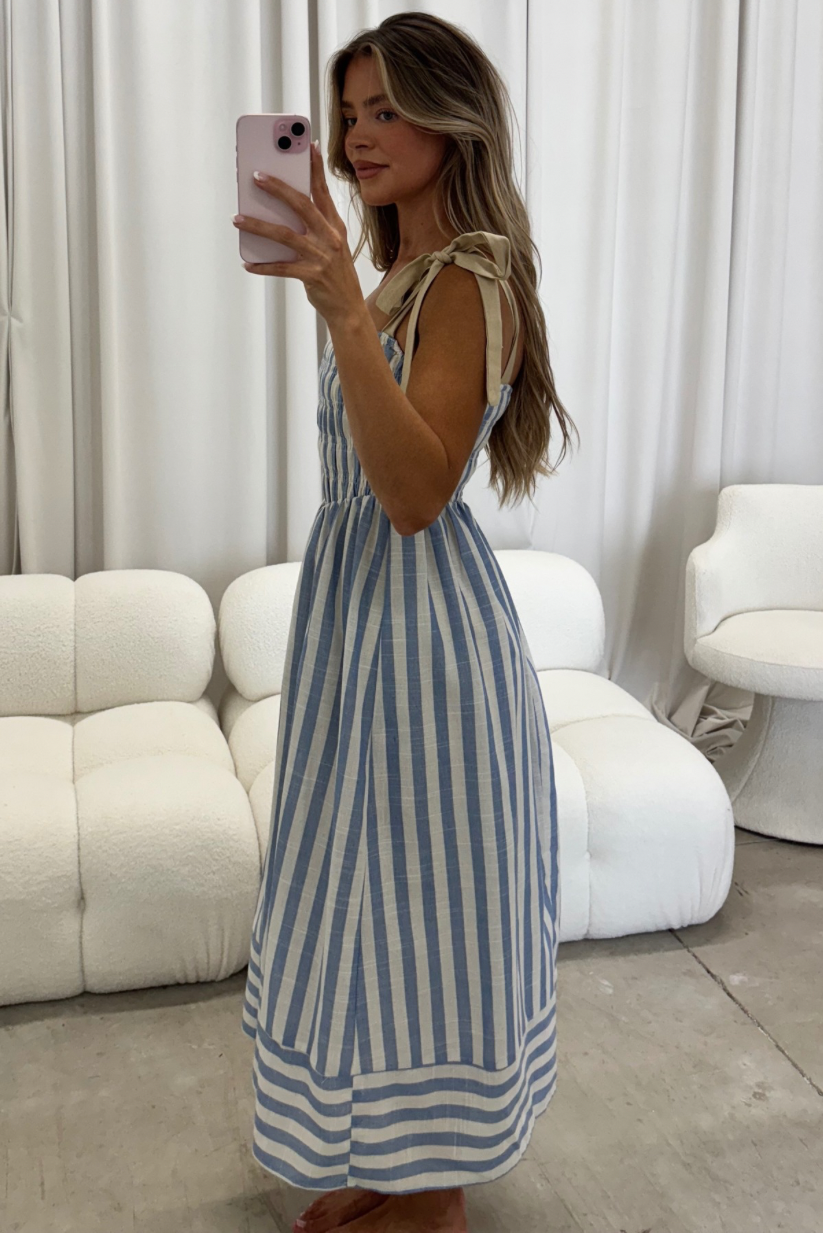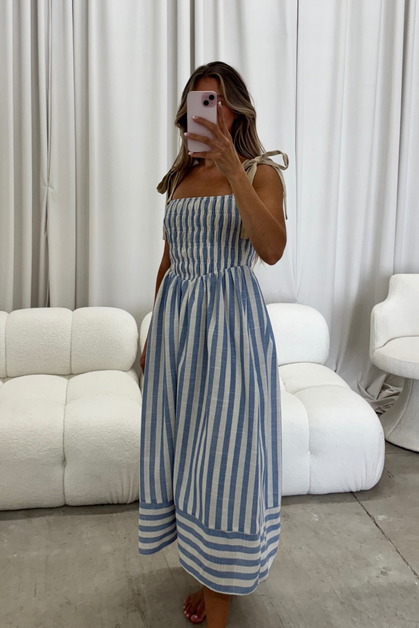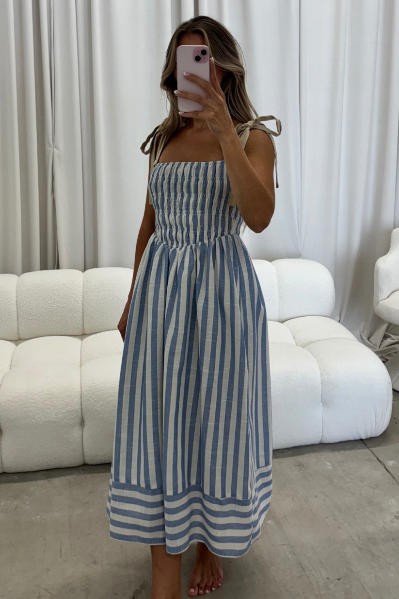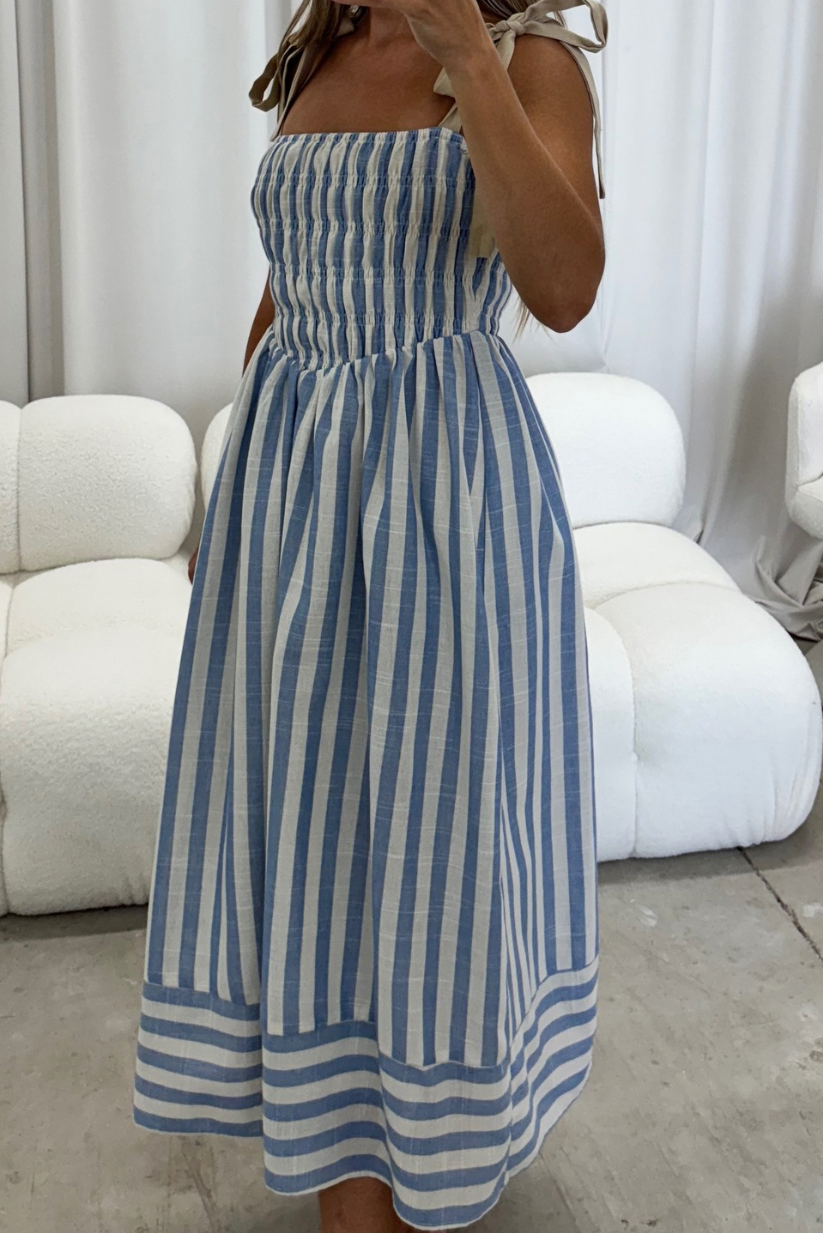 GARMENT DETAILS: Lightweight striped midi dress with square neckline, adjustable self-tie shoulder straps, chevron waist detail, and smocked bodice. Fully lined.