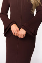 GARMENT DETAILS: Knit sweater dress with rounded neckline, long fluted sleeves, and a fit-and-flare silhouette. Features double-lined construction, raw edge hem, and exposed center seam.