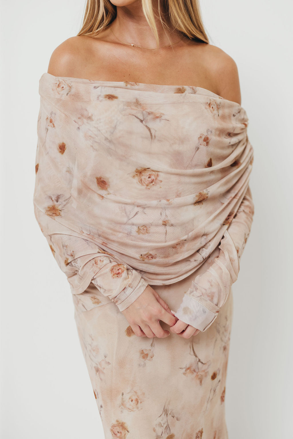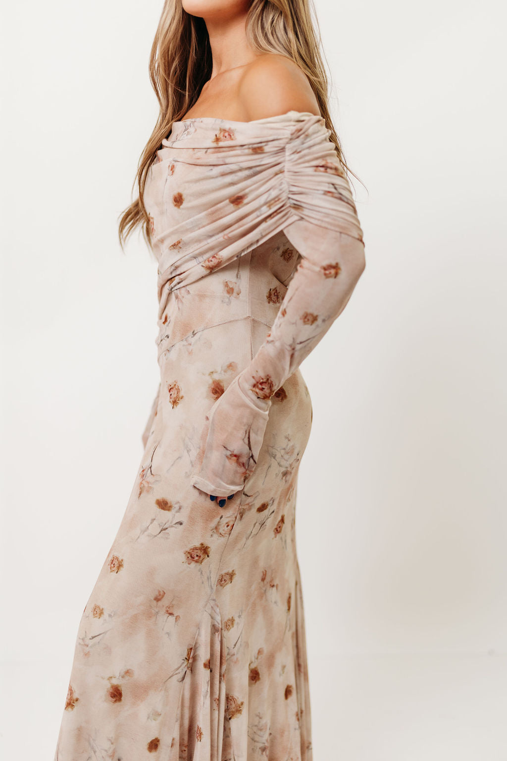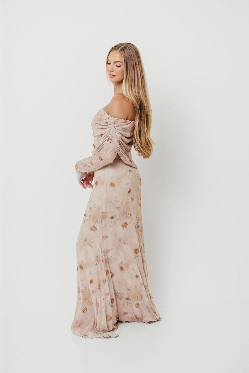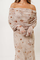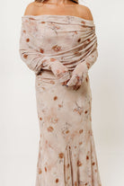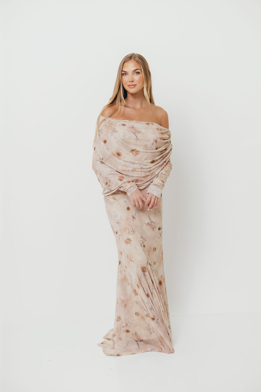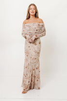 Here's a glam gown for your next red carpet moment! The Azaleia Maxi Dress flatters your curves and shows off your shoulders, with a ruched bodice and silky long sleeves that add elegance to any occasion.