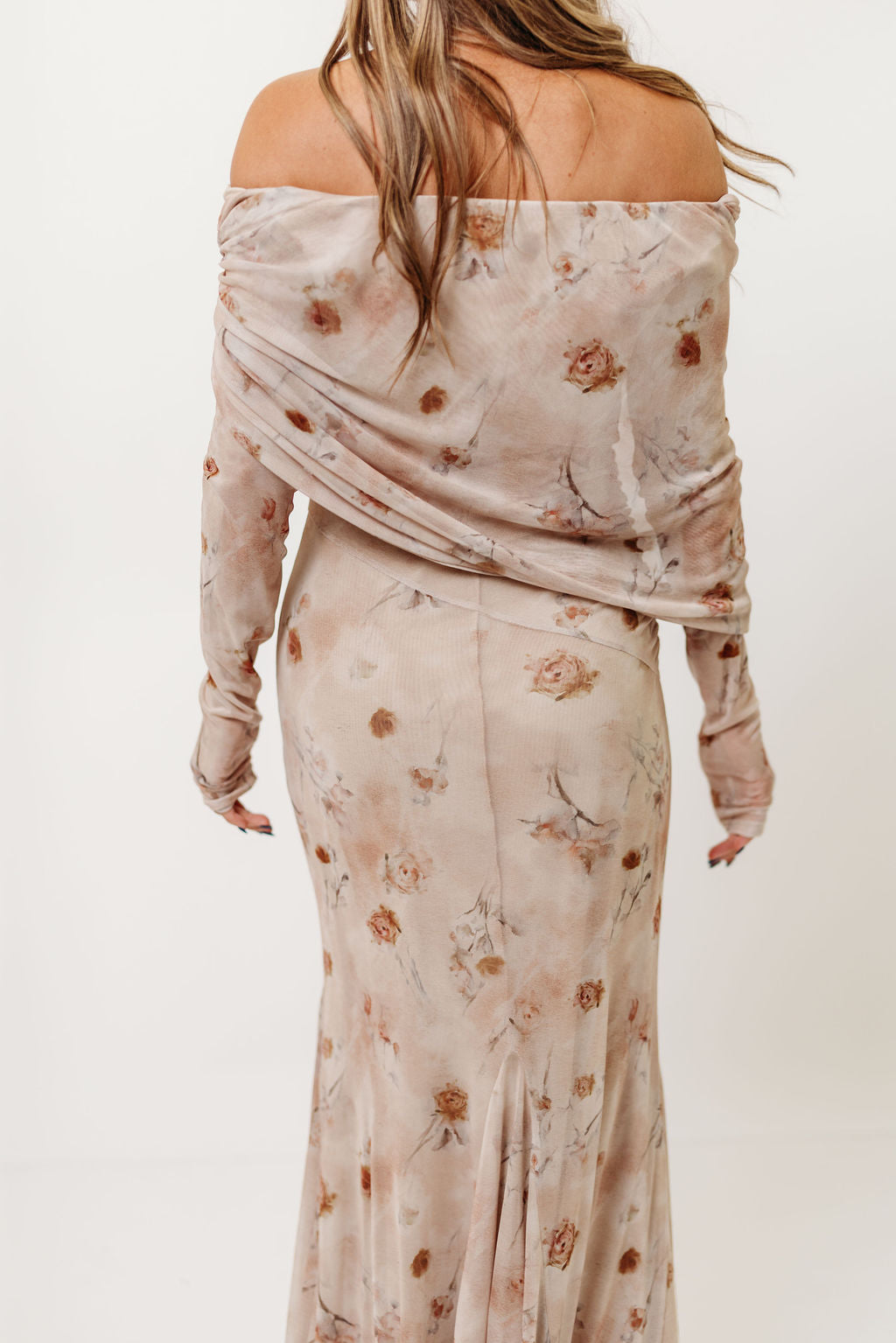GARMENT DETAILS: Elegant maxi dress with off-the-shoulder neckline, long sheer sleeves, and a flounced maxi skirt. Features full lining and a fit-and-flare silhouette.