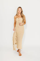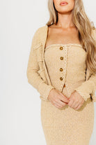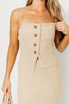 GARMENT DETAILS: Lightweight knit tube top sweater. Features a front button placket with split hem and braided trim. Sits at the natural waist.