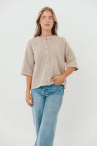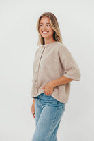 GARMENT DETAILS: Knit sweater with relaxed fit, 1/2 length sleeves, and functional front button placket.