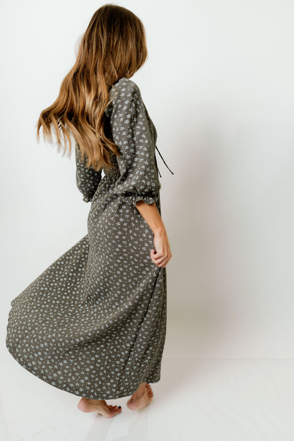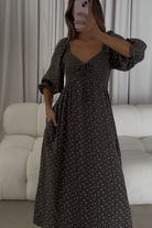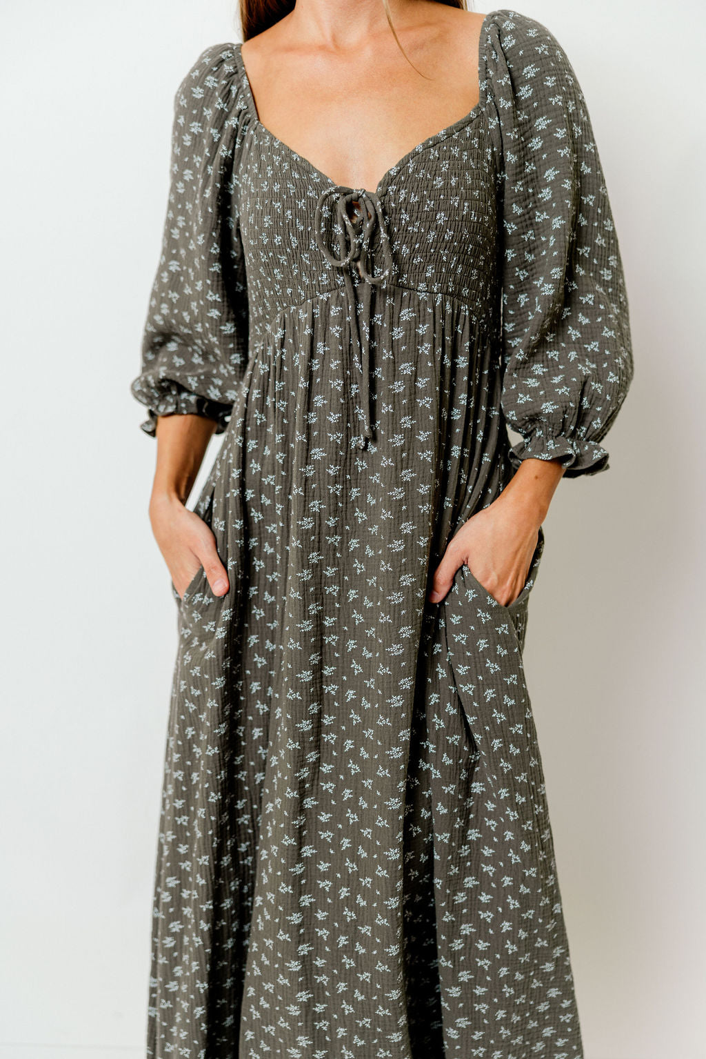 GARMENT DETAILS: Lightweight cotton maxi dress in a charming floral print, with a sweetheart neckline, 3/4 length sleeves, and an adjustable front tie detail. Features a smocked bodice, side pockets, and ruffle accents.