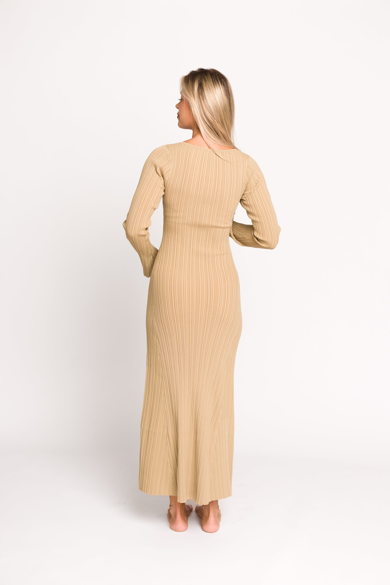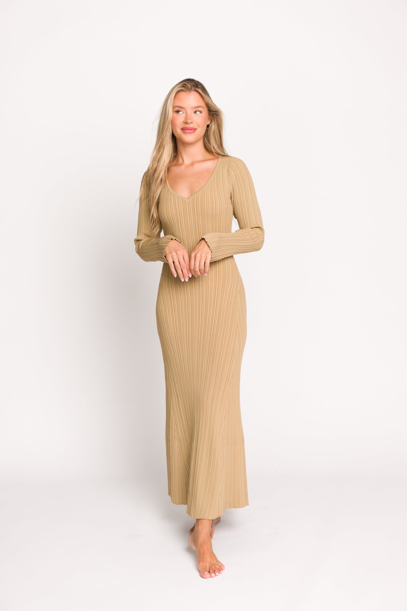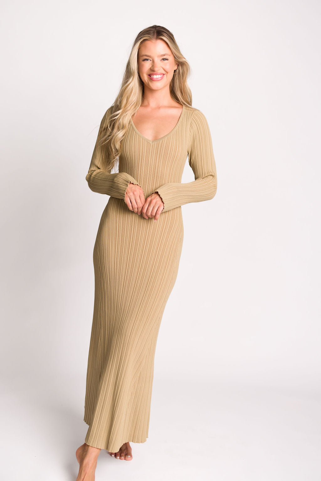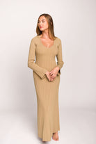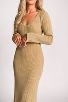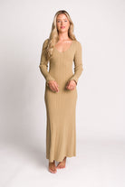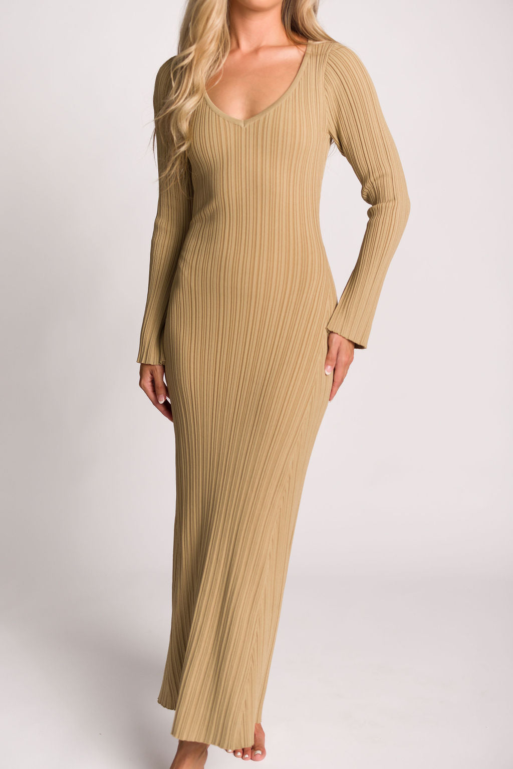 Keaton Knit Maxi Dress with V-Neckline in Beige