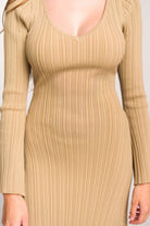 GARMENT DETAILS: Soft, ribbed-knit sweater dress with a flattering V-neckline, long sleeves, and a fitted, bodycon silhouette.
