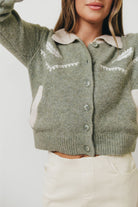 GARMENT DETAILS: Soft and feminine cardigan with long sleeves, collared neckline, and ribbed trim, with front button placket. Finished with dainty feather embroidery.