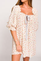 GARMENT DETAILS: Relaxed Viscose mini dress with square neckline, puffed 1/2 length sleeves, and ruffle details. Features contrast color tie and keyhole accent at neckline. Unlined.