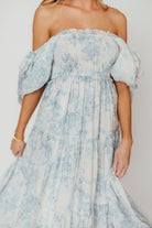This colorway features the same elegant blue toile print of our best-selling Melody Maxi Dress.