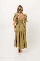 GARMENT DETAILS: Elegant midi dress with a square neckline, statement puffed sleeves, and bow accents on the shoulders. Features a fully smocked bodice, with a multi-tiered skirt.