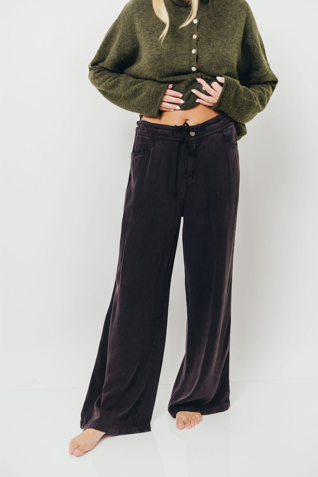 GARMENT DETAILS: Slouchy trousers in a soft Tencel Lyocell blend. Features a button/zipper closure with adjustable tie detail. Features a wide-leg silhouette, dual side pockets, and relaxed fit.