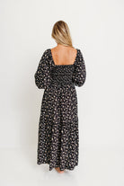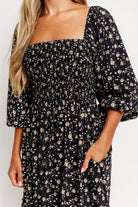 GARMENT DETAILS: Lightweight woven midi dress with square neckline, 3/4 length puffed sleeves, and a fully smocked bodice. Features a tiered skirt with ruffle accents, extra-wide maxi skirt, and partial lining.