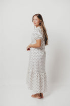 GARMENT DETAILS: Soft cotton midi dress with split neckline, adjustable cinched waist, and tiered, flowy skirt. Finished with puffed short sleeves and lining.
