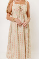 GARMENT DETAILS: Soft cotton midi dress with square neckline, wide shoulder straps, and delicate trim accents. Features a front bow detail, smocked back panel, and functional side pockets, with full lining.