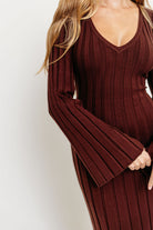 GARMENT DETAILS: Fit-and-flare thick ribbed knit maxi dress with deep V-neckline, long flared sleeves, and a full skirt. Fabric features a velvety sheen that's perfect for holidays.