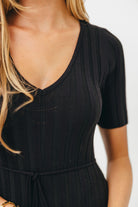 GARMENT DETAILS: Mid-weight, silky ribbed knit maxi dress with 1/2 length short sleeves and V-neckline. Finished with an attached, adjustable waist tie.