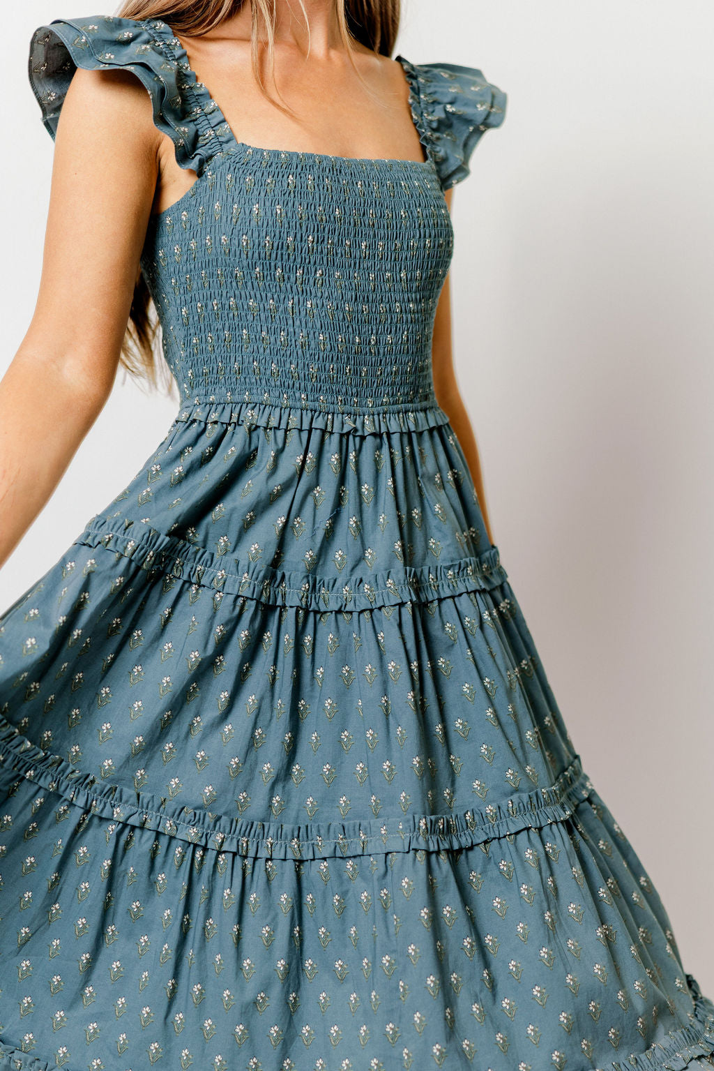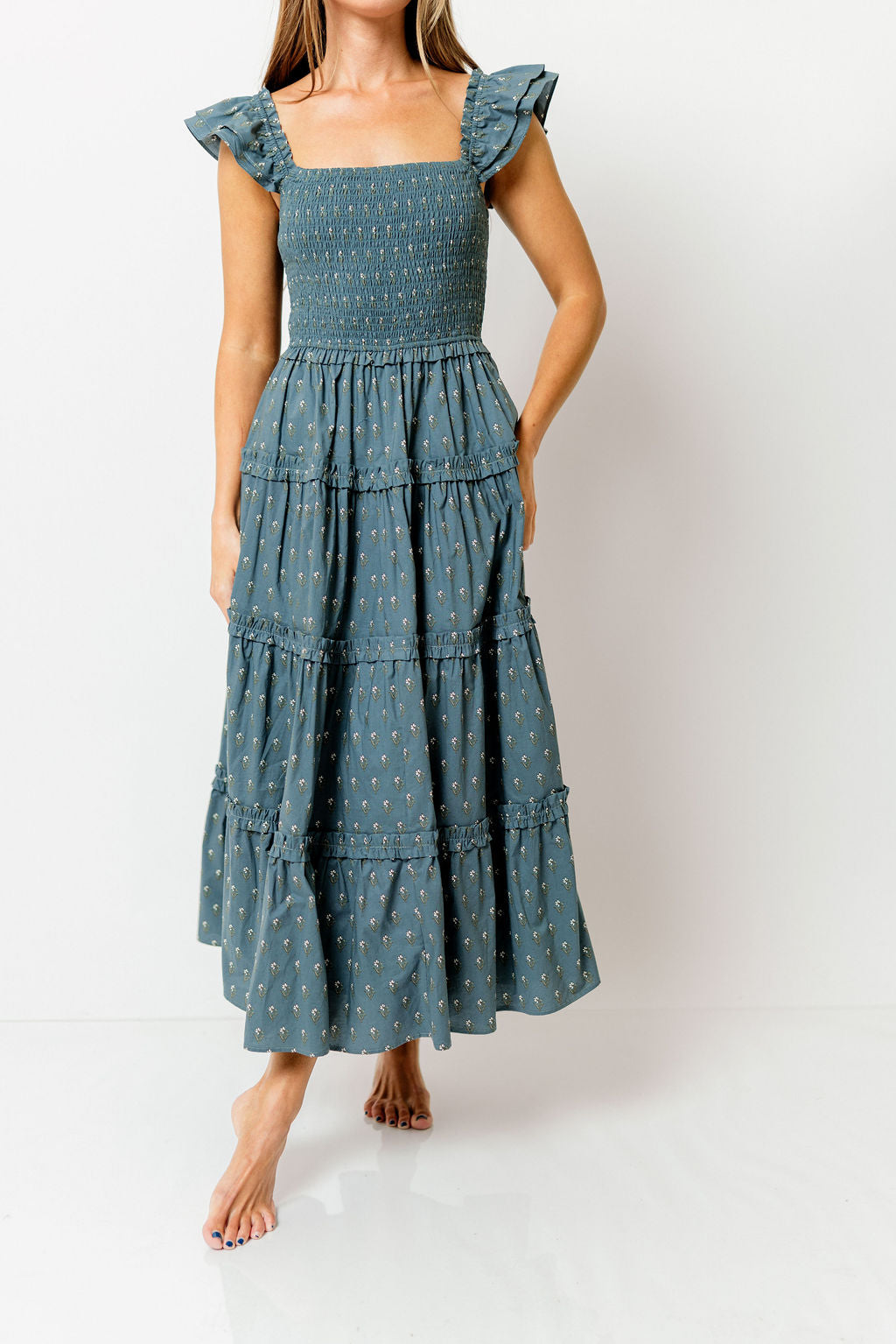Isabel Ruffle Sleeve Midi Dress in Slate Grey Floral