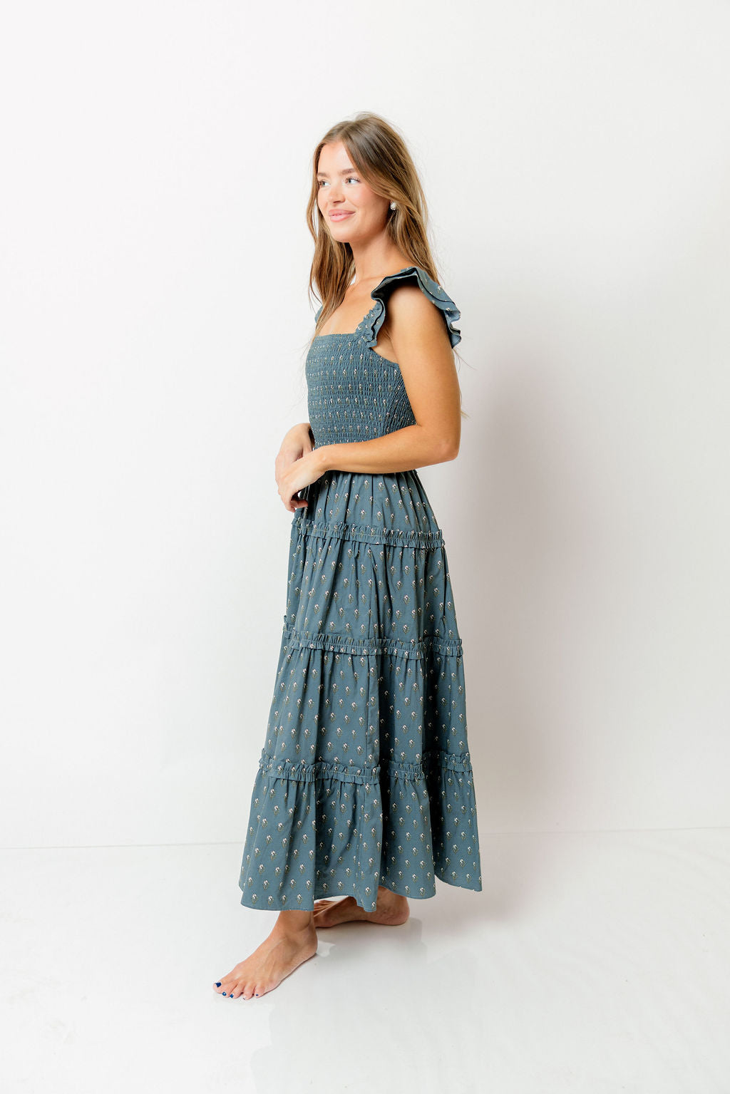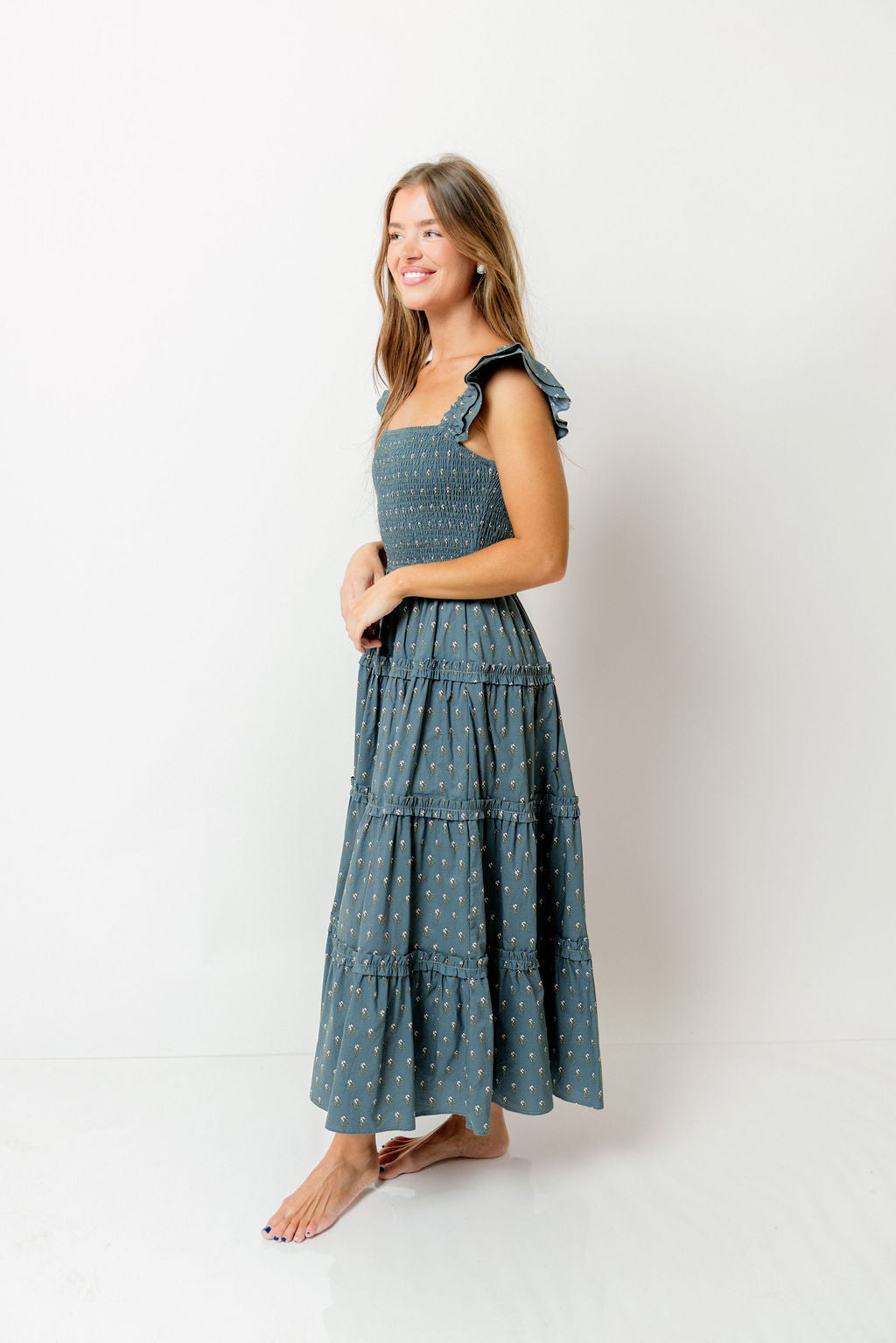 GARMENT DETAILS: Cotton midi dress with square neckline, ruffled flutter sleeves, and fully smocked, stretchy bodice. Features a multi-tiered skirt with gathered seams, and a micro floral print. Lined.