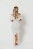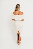 GARMENT DETAILS: Midweight sweater knit maxi dress in a fitted bodycon silhouette with off-the-shoulder neckline and front bow statement detail. Features a ribbed knit construction and center back slit.