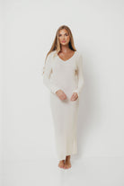 GARMENT DETAILS: Long-sleeved maxi dress in a soft, textured ribbed knit. Features V-neckline, with a fitted silhouette and straight skirt.