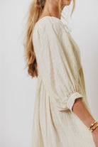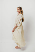 GARMENT DETAILS: Soft and feminine maxi dress with V-neckline, 3/4 length sleeves, and relaxed fit with wide, flowy skirt.