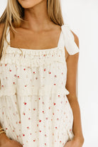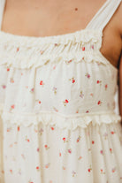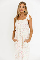 GARMENT DETAILS: Lightweight, feminine maxi dress in a dainty floral print. Features square neckline, adjustable self-tie shoulder straps, and relaxed fit with eyelet ruffle details. Finished with side pockets.