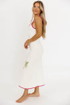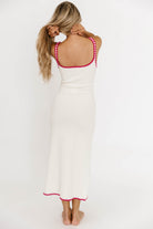 GARMENT DETAILS: Slim-fit sweater knit midi dress with square neckline, tropical-themed embroider, and contrast color trim.