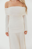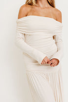 GARMENT DETAILS: Elegant maxi dress with a folded off-the-shoulder neckline, long sleeves, and full pleated maxi skirt. Finished with a dropped waist and full lining.