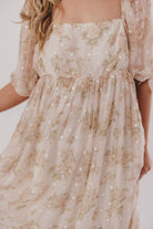 GARMENT DETAILS: Empire-waisted maxi dress in a creamy floral pattern. Features square neckline, sheer 3/4 length puffed sleeves, and bust darts, with a stretchy, smocked back panel. Lined.