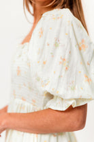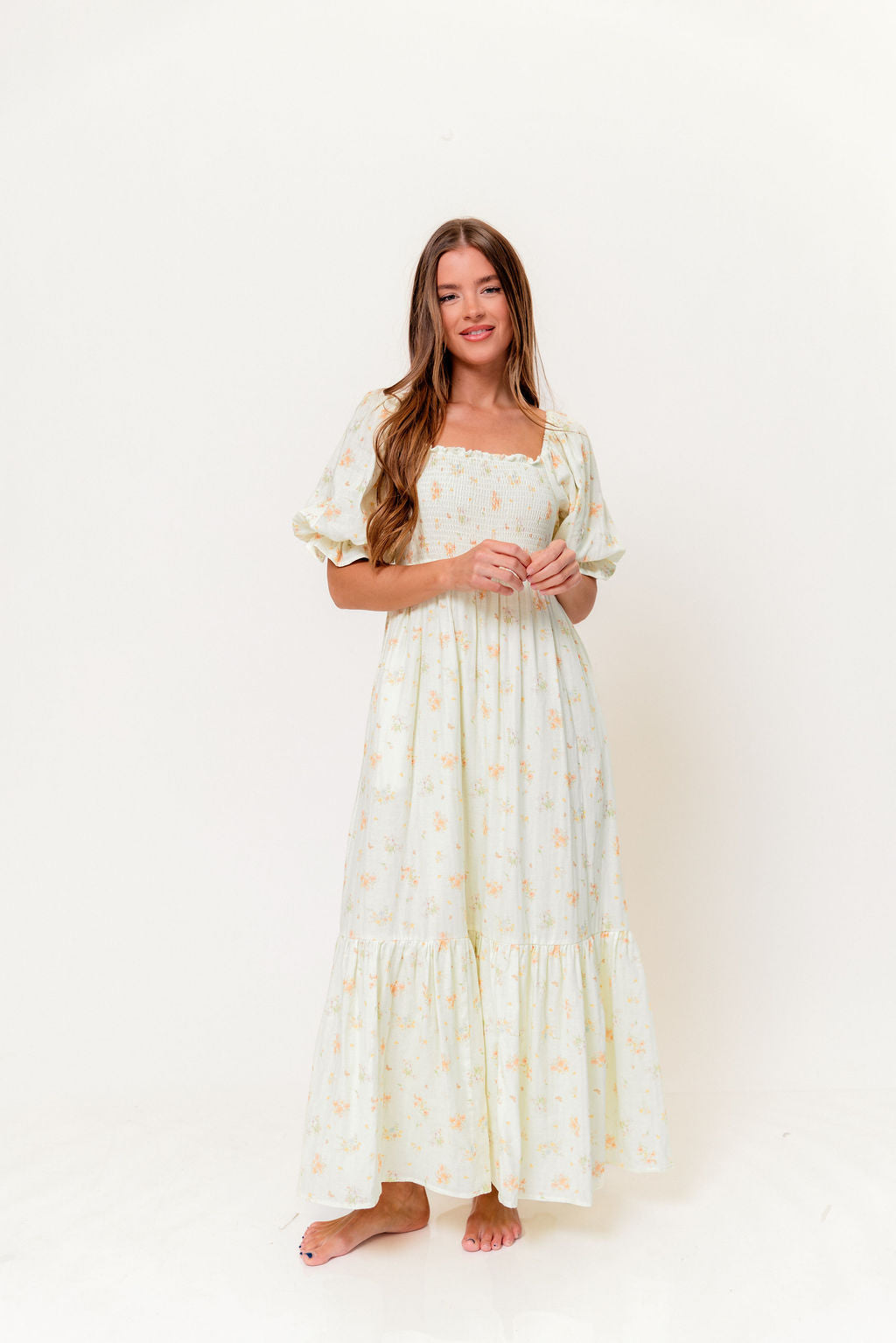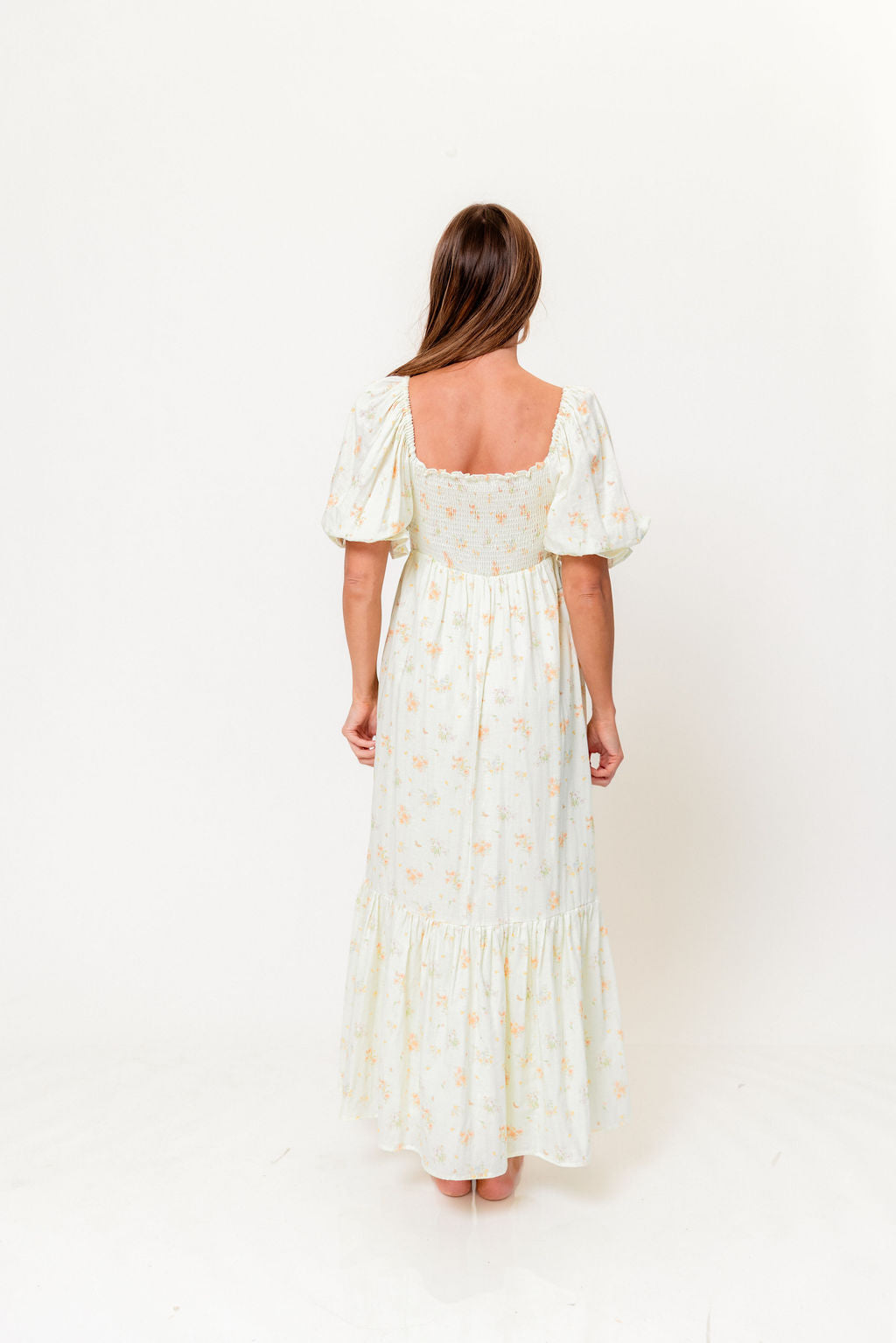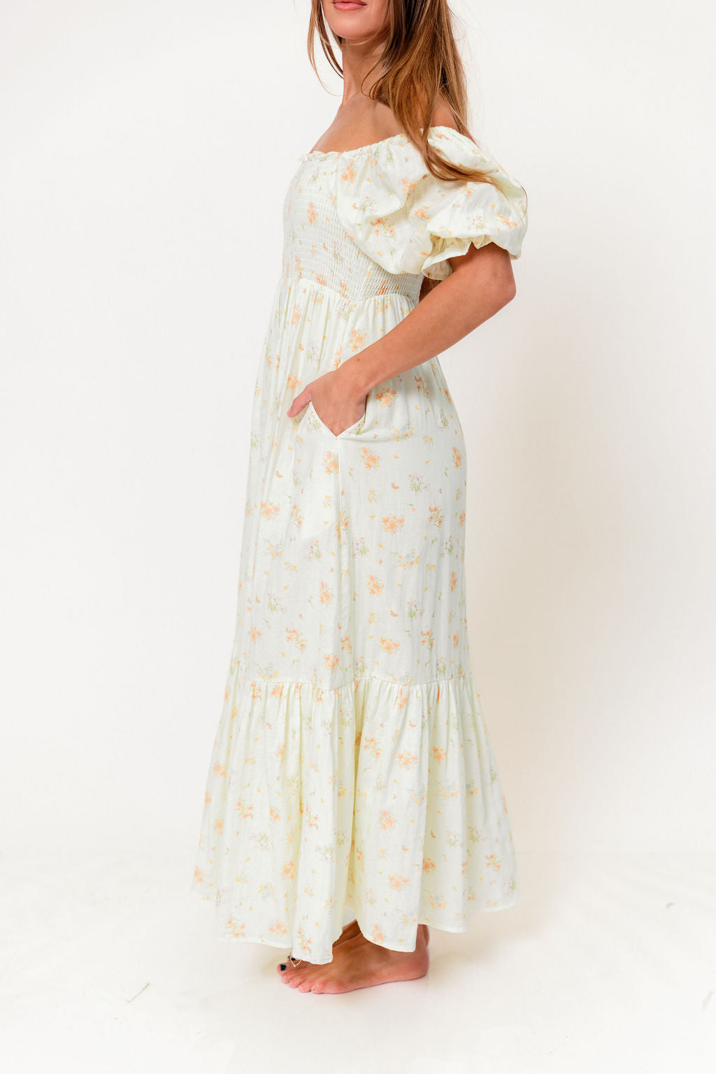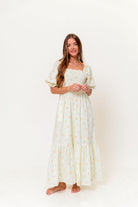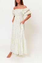 GARMENT DETAILS: Lightweight 100% cotton maxi dress with square neckline, short puff sleeves, and fully smocked, stretchy bodice. Features an elegant floral print and side pockets. Elasticated neckline can be worn on or off the shoulders. Lined.