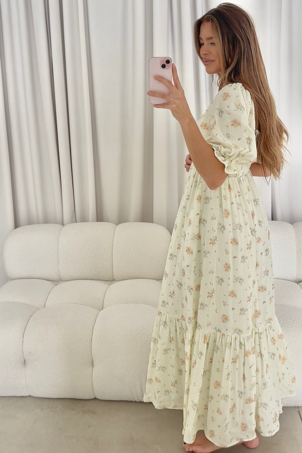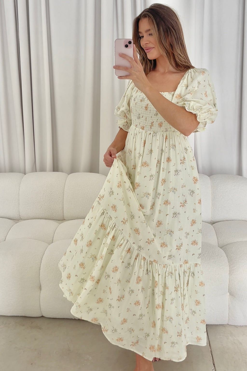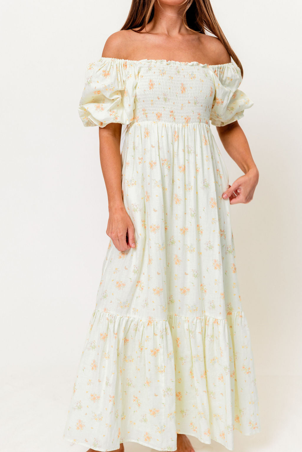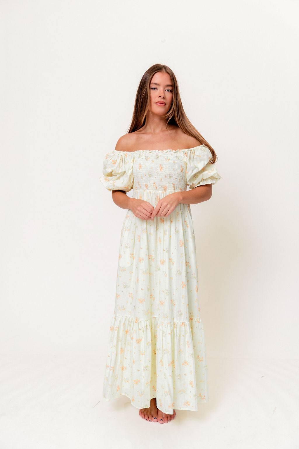 GARMENT DETAILS: Lightweight 100% cotton maxi dress with square neckline, short puff sleeves, and fully smocked, stretchy bodice. Features an elegant floral print and side pockets. Elasticated neckline can be worn on or off the shoulders. Lined.