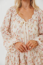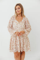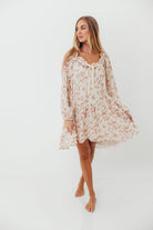 GARMENT DETAILS: Lightweight woven mini dress in a delicate floral pattern, with rounded neckline and adjustable ribbon-tie detail. Features long sheer sleeves with elasticated cuffs, ruffle details, and lining.