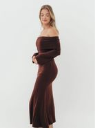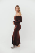 GARMENT DETAILS: Sleek and fitted maxi dress in a luxuriously soft knit. Features a folded off-the-shoulder neckline with long sleeves and a fit-and-flare design that is fitted through the hips and thighs and flares at the knee. Fully lined for maximum coverage and comfort.
