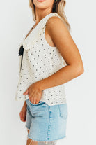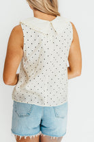 Introducing the Nelly Blouse in Cream! Bring a touch of whimsical charm to your wardrobe with this polka dot printed sleeveless blouse. And don't forget the Peter Pan collar for that extra dash of playful style. Perfect for adding some fun to your day!