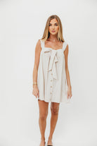 GARMENT DETAILS: Soft, premium cotton mini dress in a babydoll swing-style silhouette. Features a sweetheart neckline with statement bow detail, front button placket, and adjustable buttoned shoulder straps.