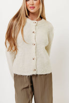 GARMENT DETAILS: Soft classic knit cardigan with rounded neckline, long sleeves, and dainty front button placket.
