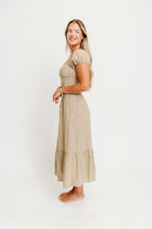 GARMENT DETAILS: Lightweight maxi dress in a delicate plaid print, with square neckline, defined and ruched bust, and puffed short sleeves. Features a functional front button placket, tiered skirt, and side pockets. Lined.