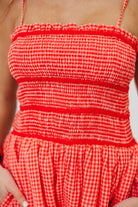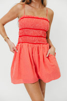 GARMENT DETAILS: Lightweight cotton-blend shortie romper in a charming gingham print. Features a tiered, smocked bodice, square neckline with adjustable straps, and side pockets.